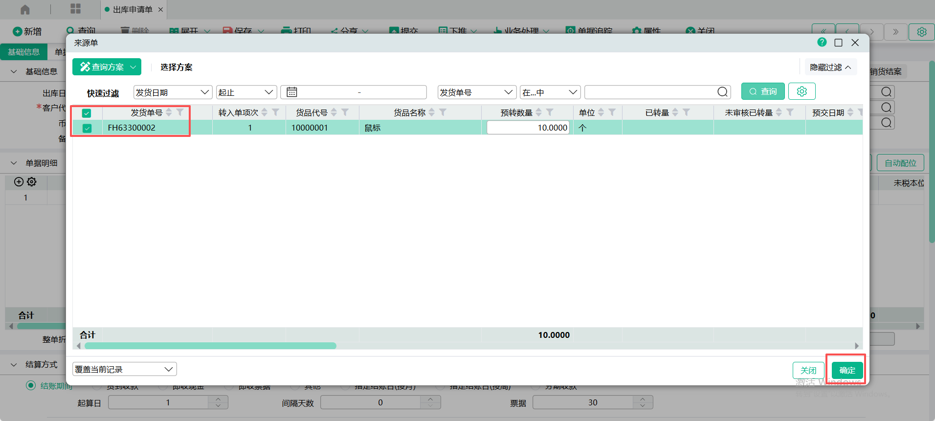 (2)、进入【出库申请单】页面,点入表头【转入单号】查询窗口,输入过滤条件,查询发货计划单,勾选要转入的单据记录,点【确定】 ;
