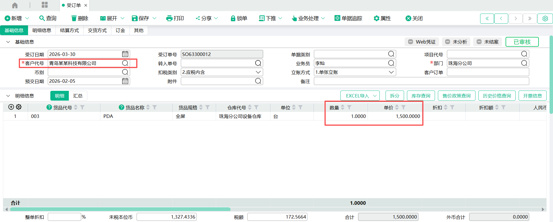 (1)新增一张【受订单】
