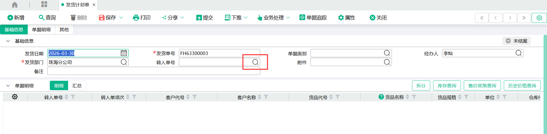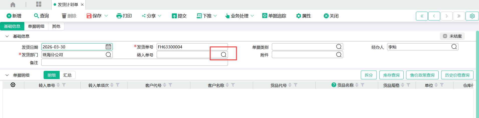 菜单位置:供应链——销售管理——出库管理——发货计划单