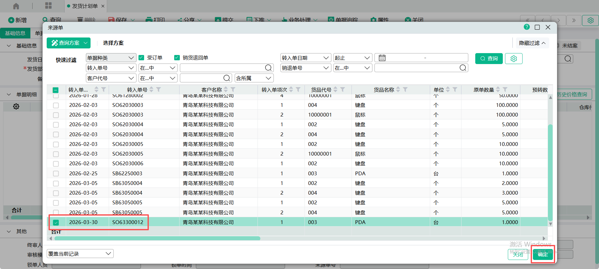 (2)进入【发货计划单】页面,点入表头【转入单号】查询窗口,输入过滤条件,查询出受订单,勾选要转入的单据记录,点【确定】 ;