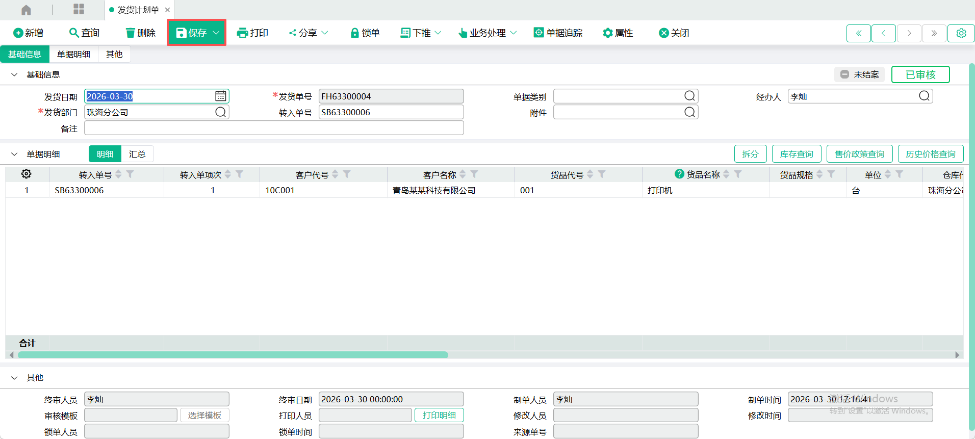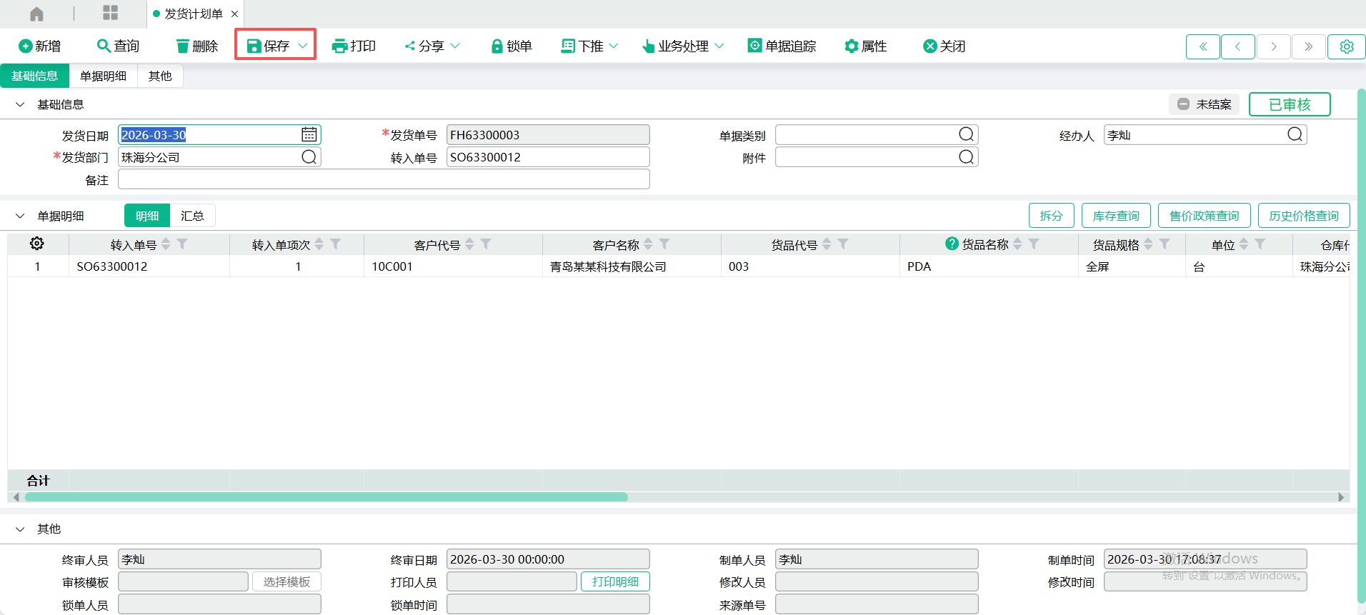 (3)、带入表身记录后,点【保存】。