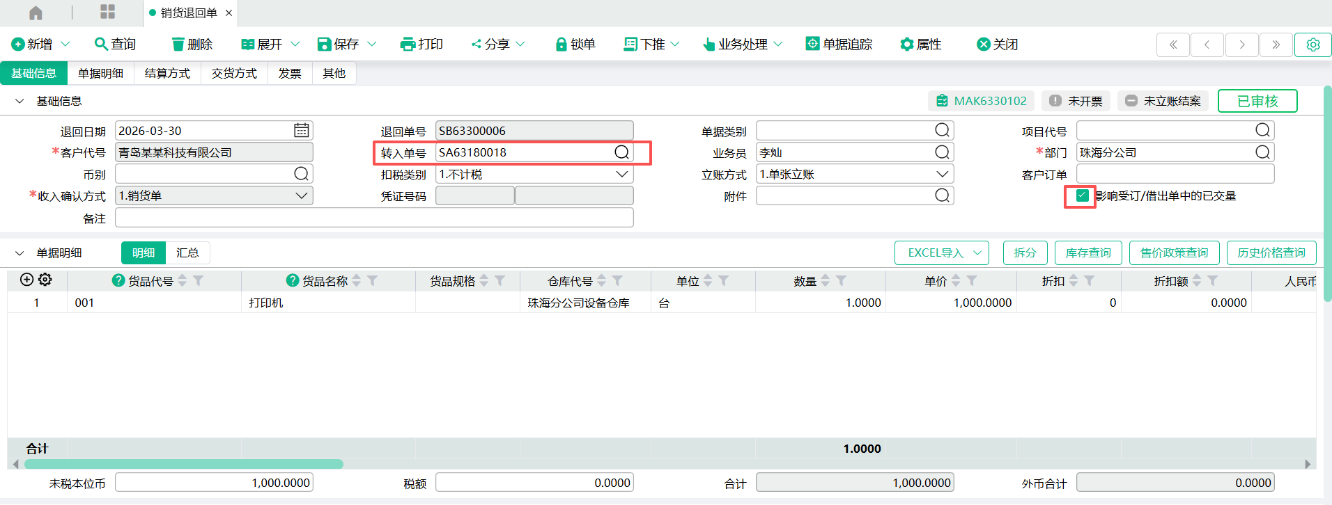 【销货退回单】→【发货计划单】
