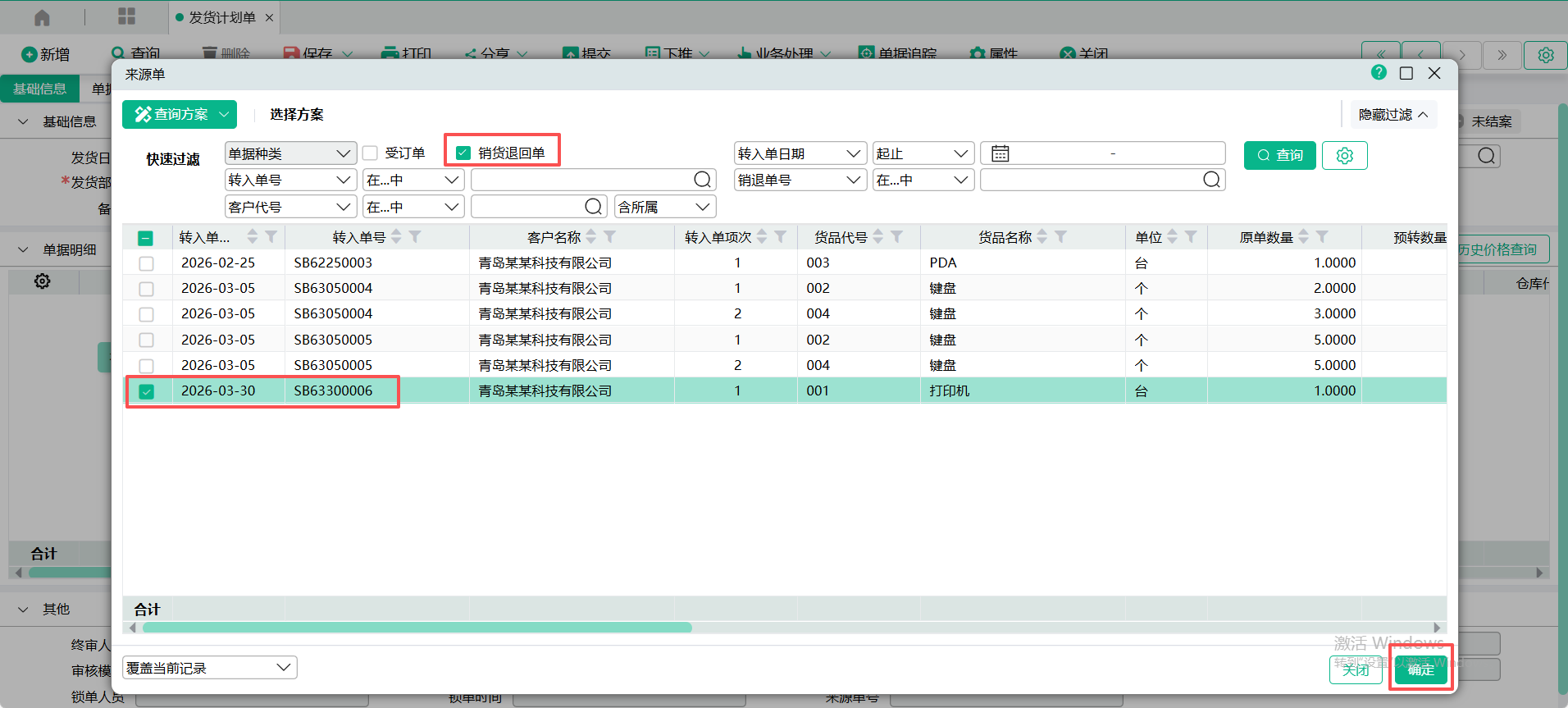(2)、进入【发货计划单】页面,点入表头【转入单号】查询窗口,输入过滤条件,查询销货退回单,勾选要转入的单据记录,点【确定】 ;