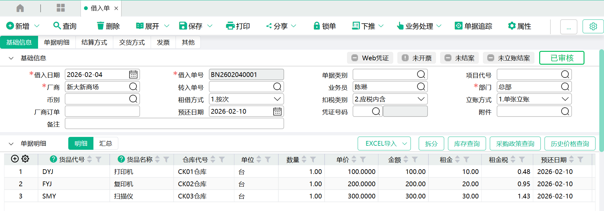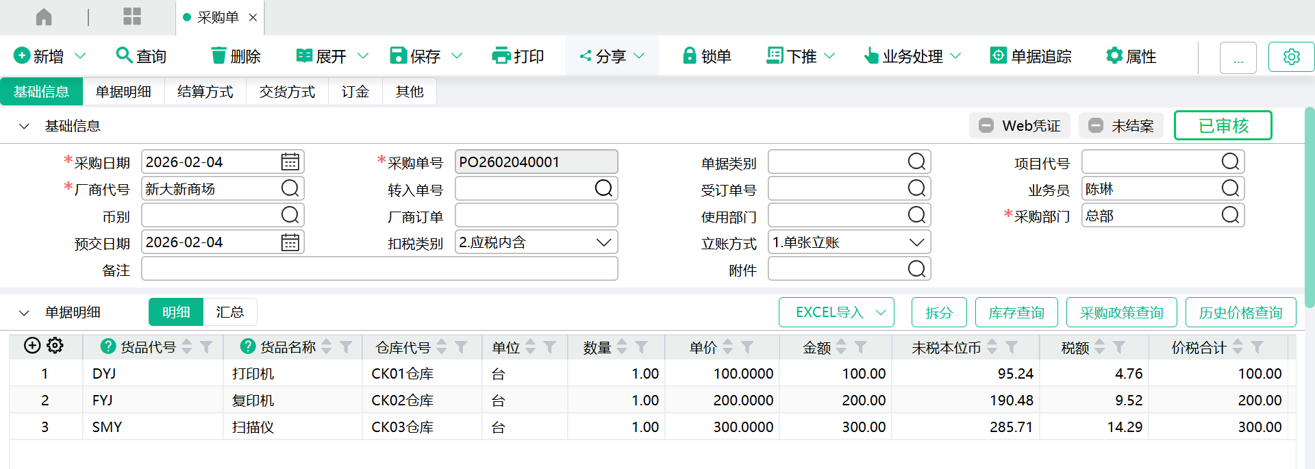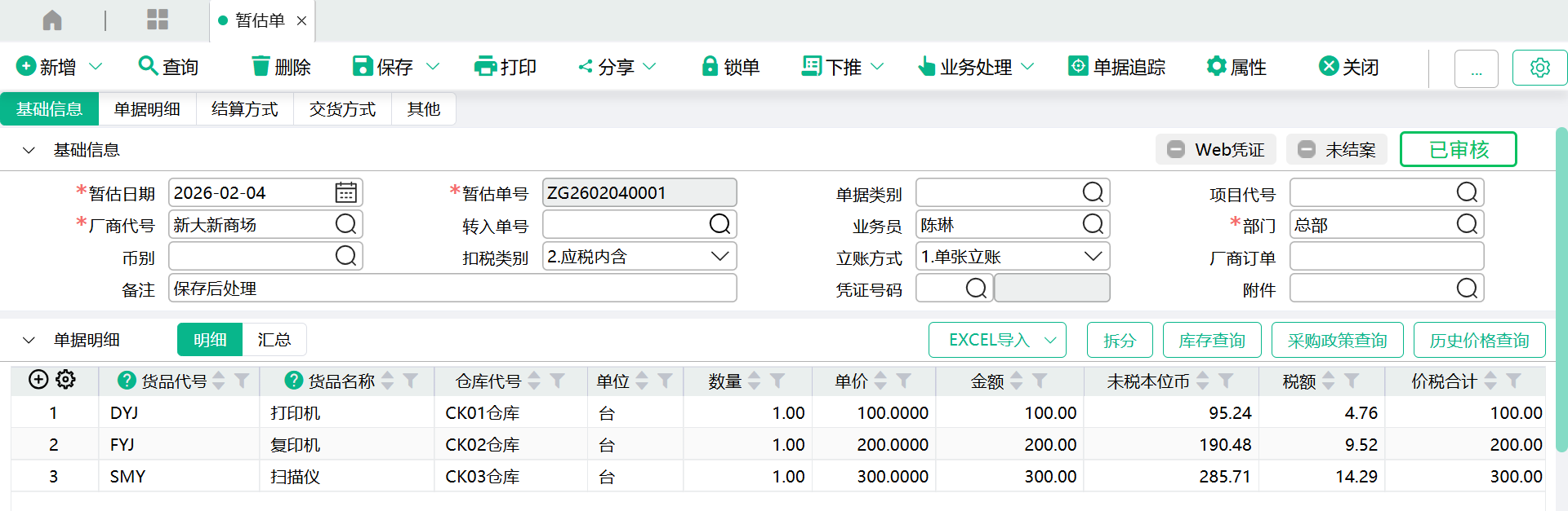 (2)、应付账款:当表头立账方式为单张立账时,产生应付账款。