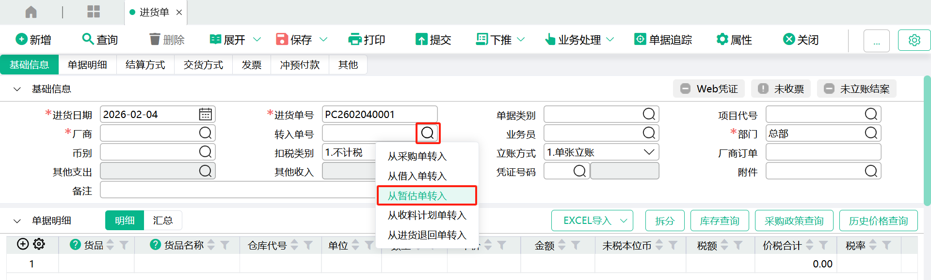 (2)、进入【进货单】页面,点入表头【转入单号】-【从暂估单转入】查询窗口,输入过滤条件,查询出采购单,勾选要转入的单据记录,点【确定】;