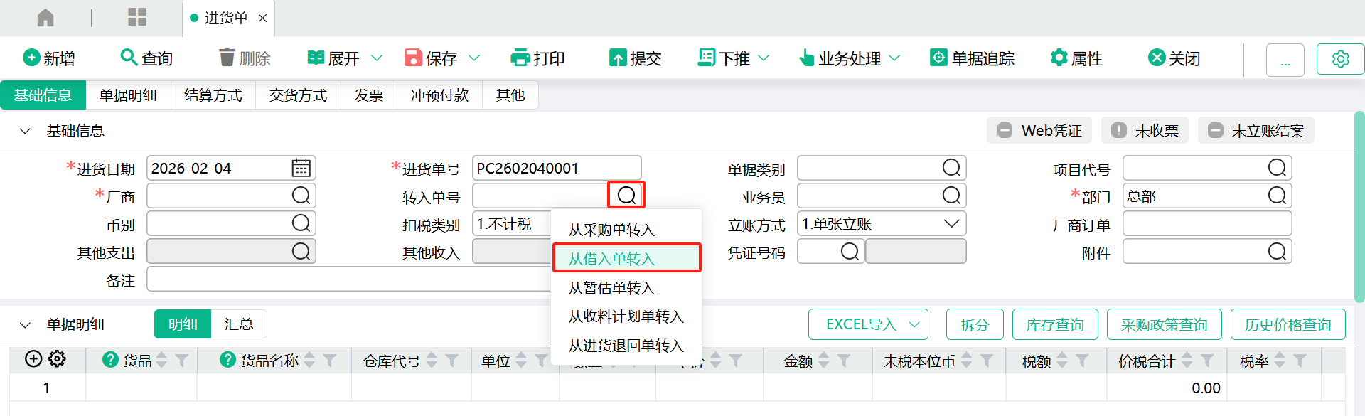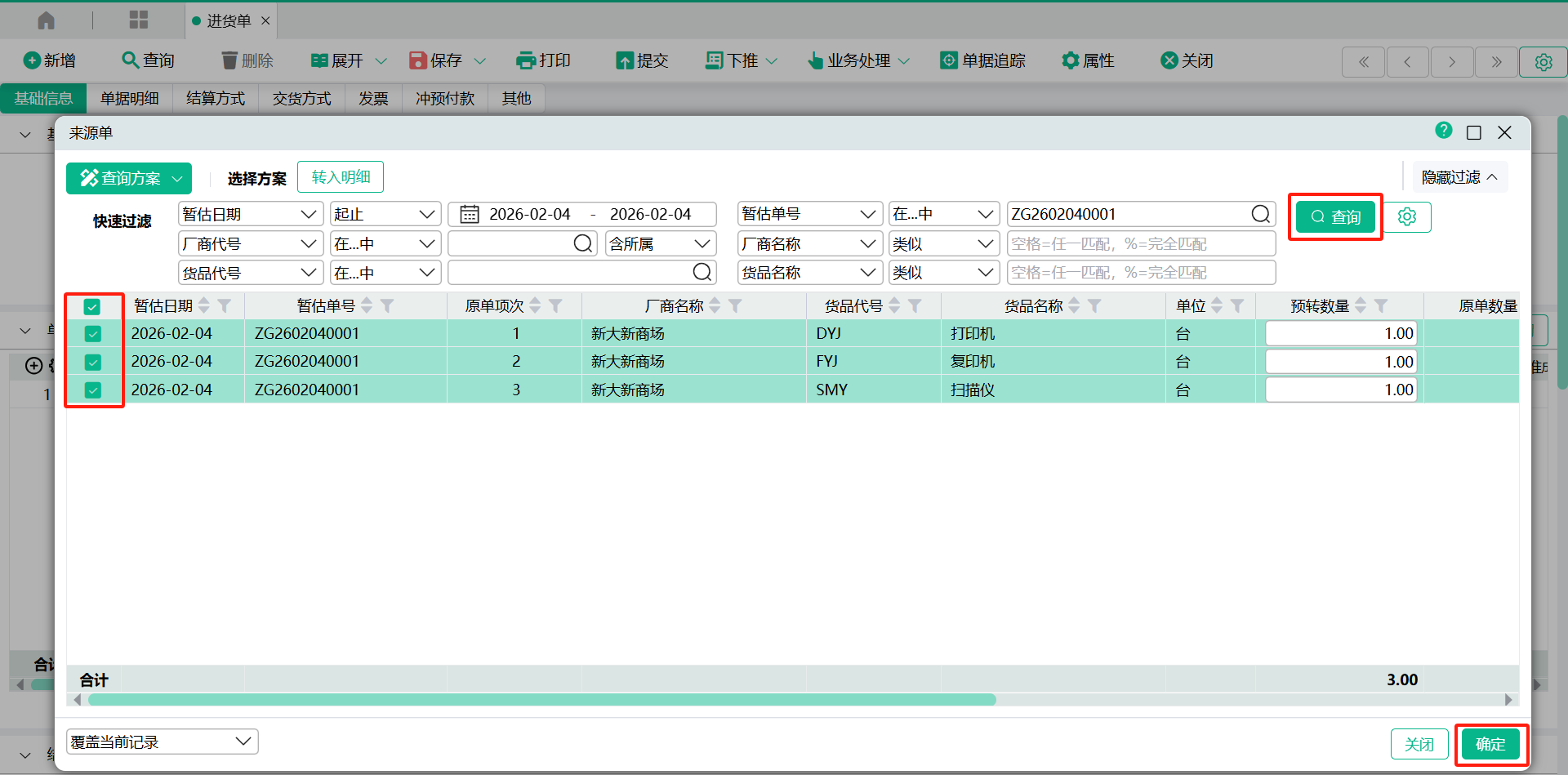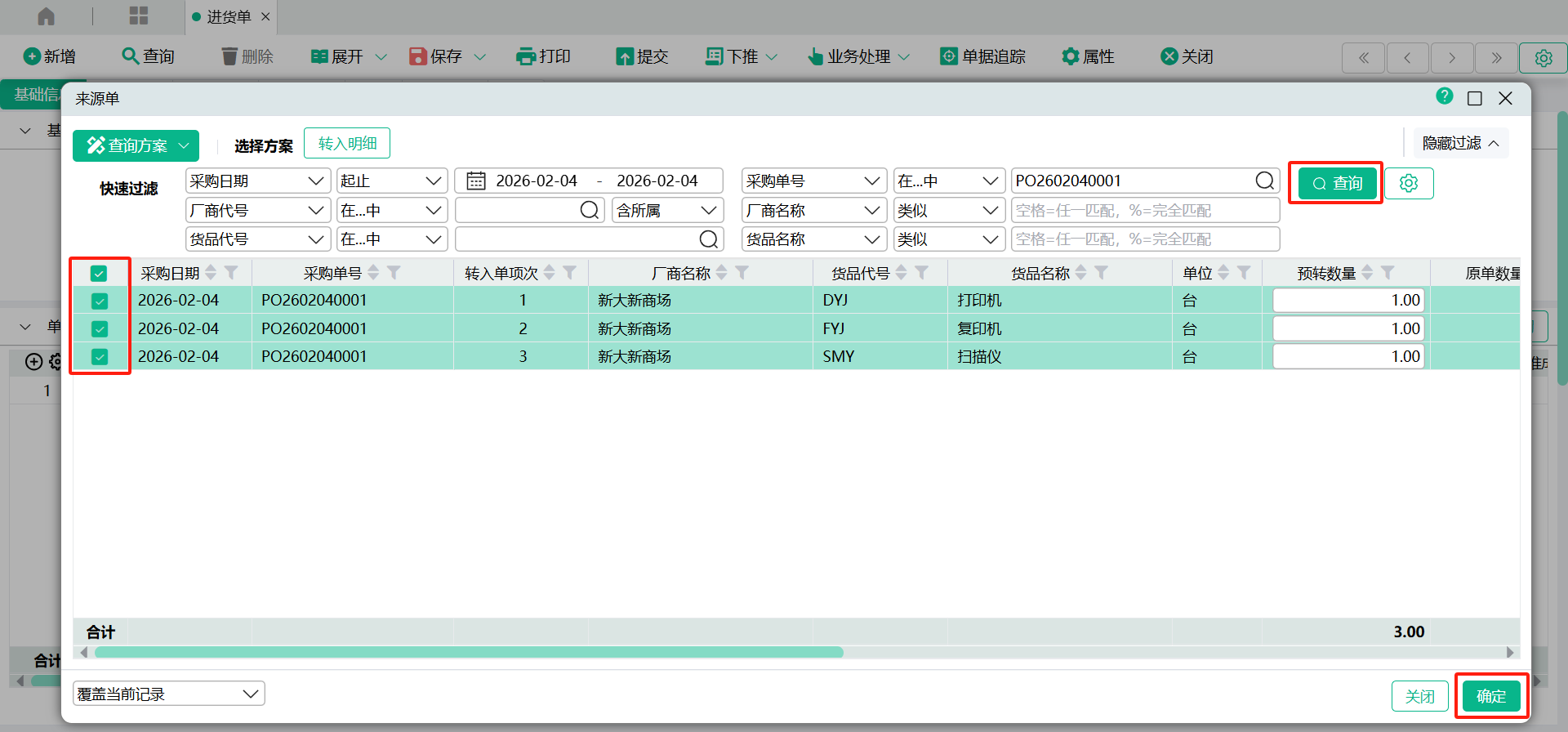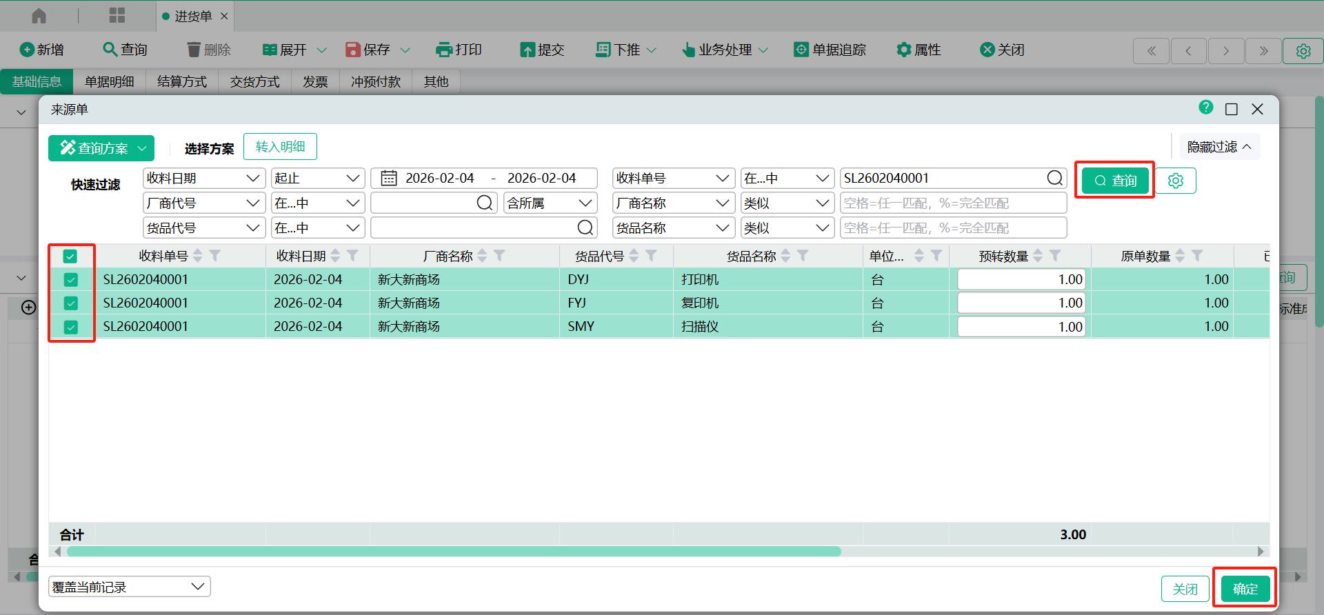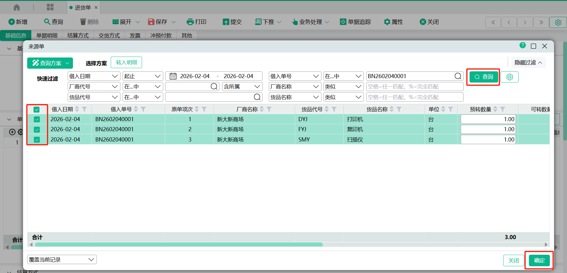 (2)、进入【进货单】页面,点入表头【转入单号】-【从借入单转入】查询窗口,输入过滤条件,查询出采购单,勾选要转入的单据记录,点【确定】;