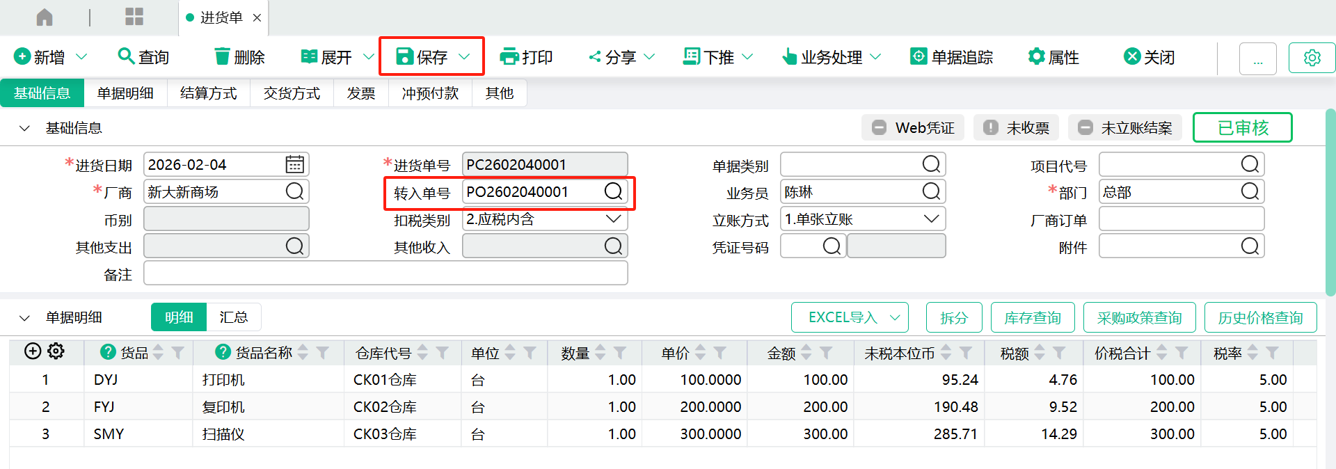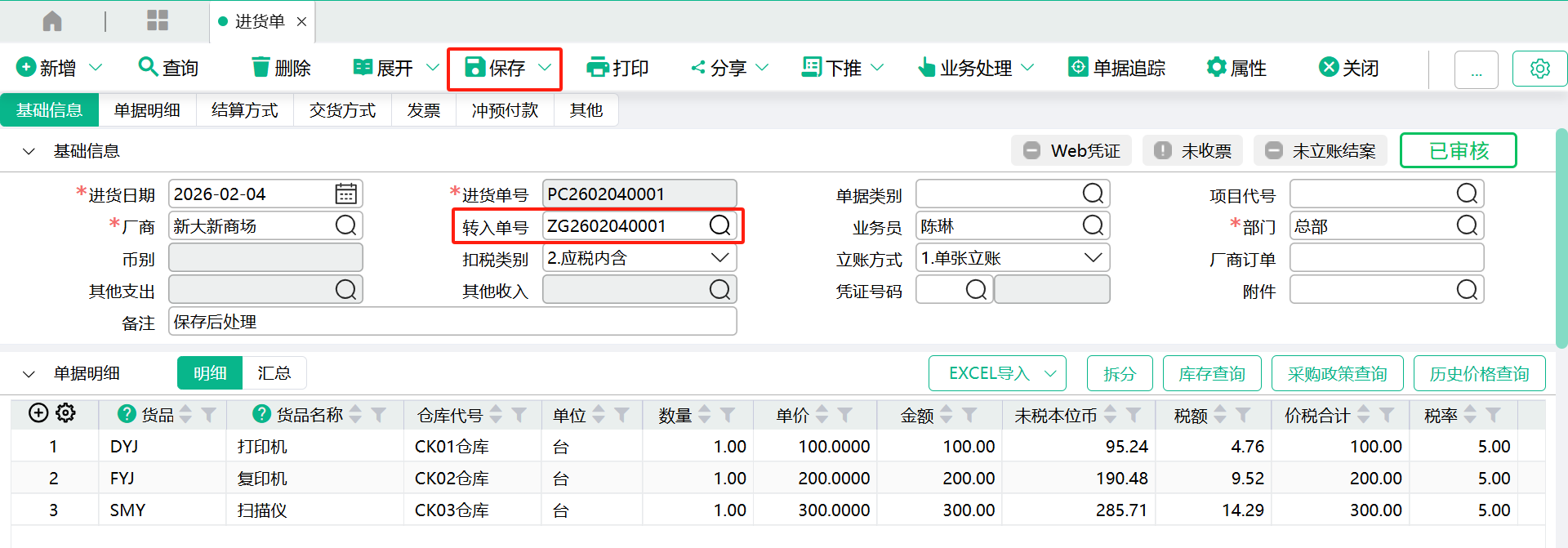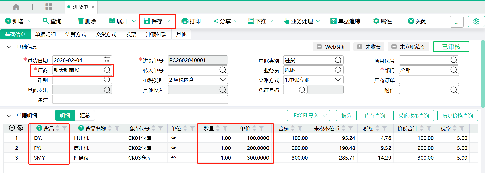 (1)、进入【进货单】页面,输入表头厂商、部门,输入表身货品、仓库代号、数量、单价,点【保存】。