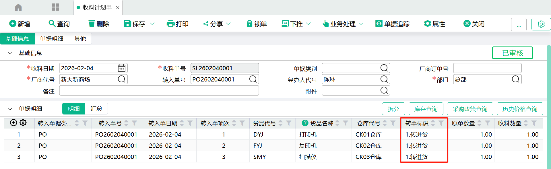 (3)、来源单回写:从采购单转入,回写采购单表身【未审核已交量】;从借入单转入,回写借入单表身【未审核已还量】;从暂估单转入,回写暂估单表身【未审核已进货量】;从收料计划单转入,回写收料计划单表身【未审核已转数量】;从进货退回单转入,回写进货退回单表身【未审核销货量】。