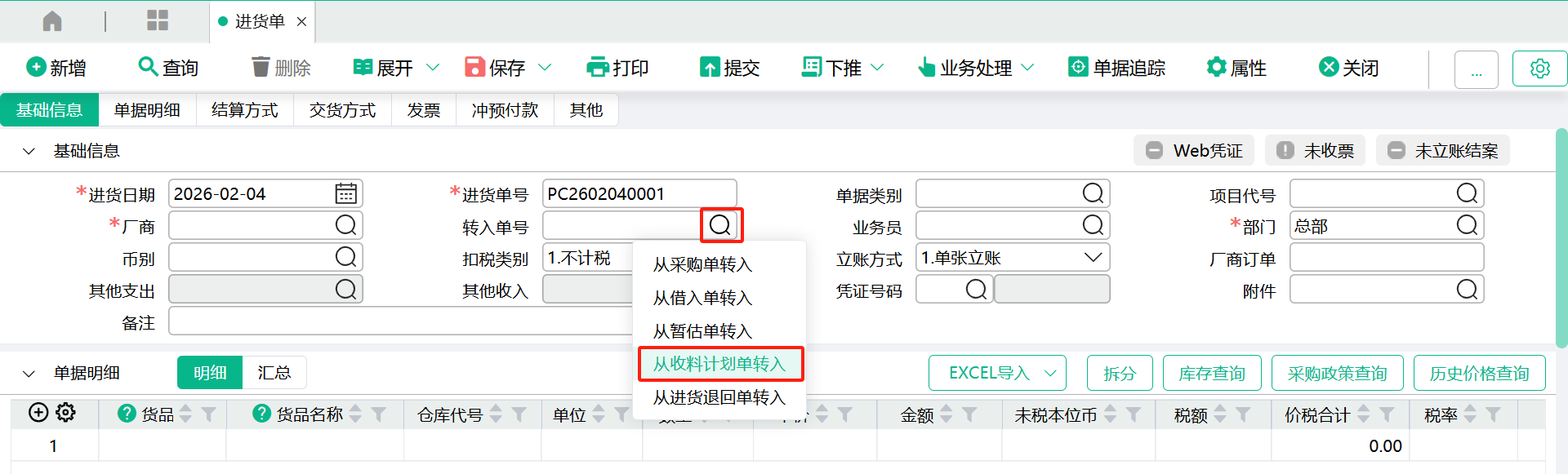 (2)、进入【进货单】页面,点入表头【转入单号】-【从收料计划单转入】查询窗口,输入过滤条件,查询出采购单,勾选要转入的单据记录,点【确定】;