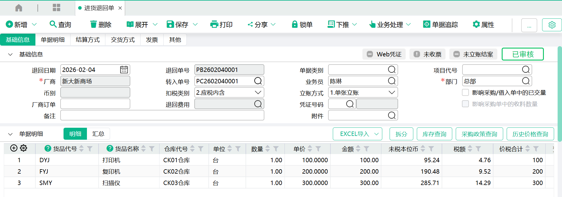 | 进货退回 | 进货单转后续已终审的进货退回单的数量会回写在此。 |
