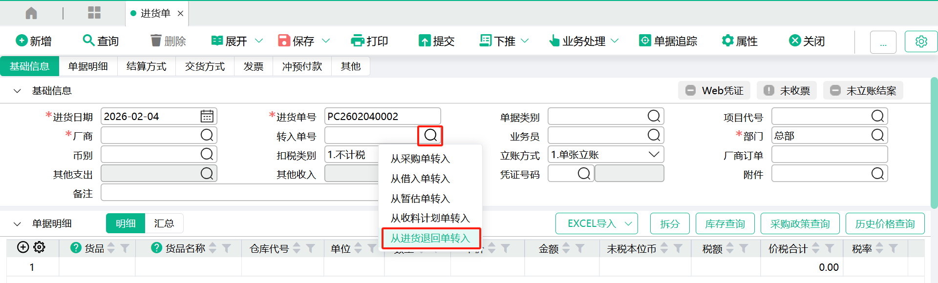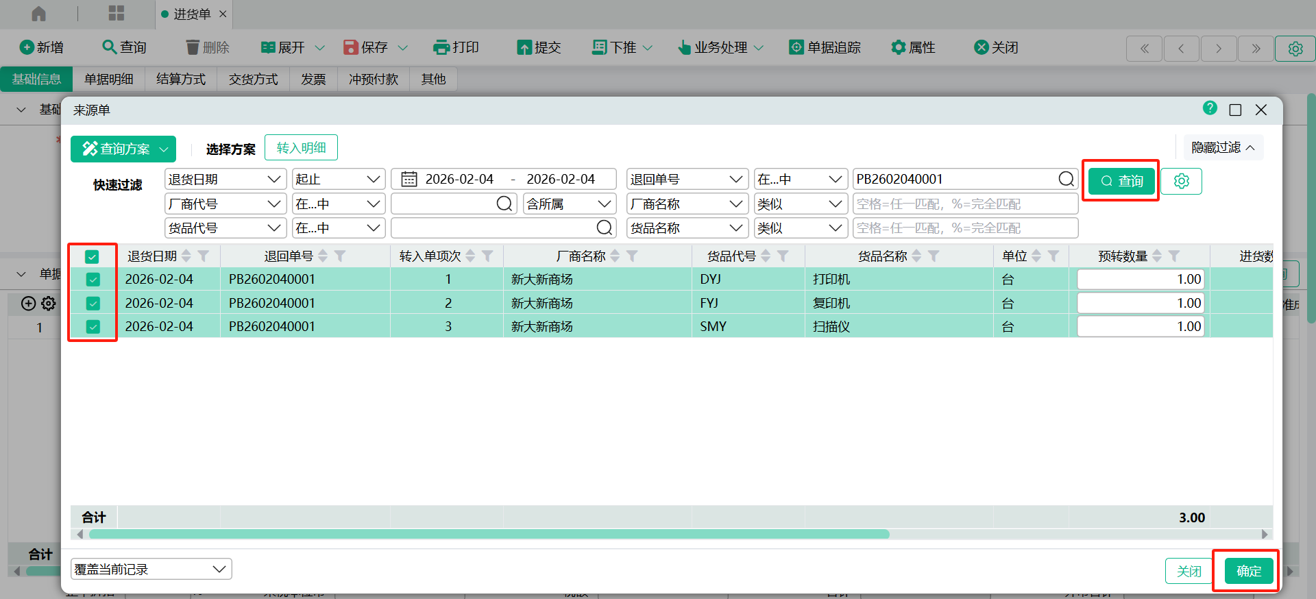 (2)、进入【进货单】页面,点入表头【转入单号】-【从进货退回单转入】查询窗口,输入过滤条件,查询出采购单,勾选要转入的单据记录,点【确定】;