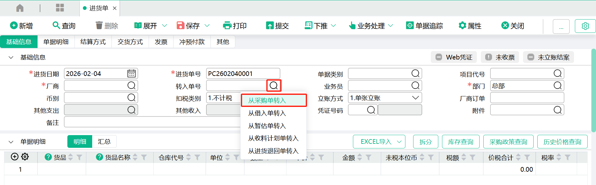 (2)、进入【进货单】页面,点入表头【转入单号】-【从采购单转入】查询窗口,输入过滤条件,查询出采购单,勾选要转入的单据记录,点【确定】;