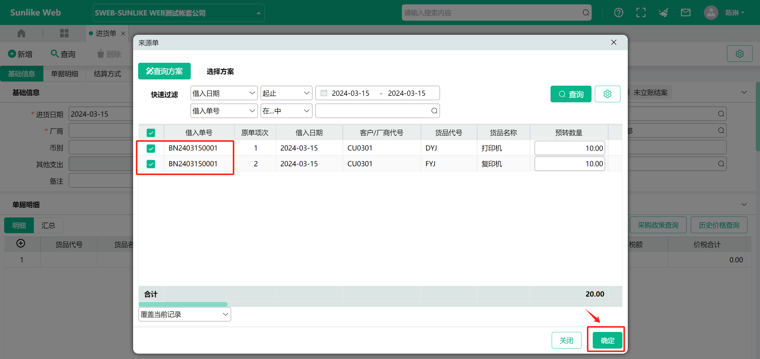 5、在来源【借入单】查询窗口,勾选要转入的借入单号、货品代号记录,点【确定】按钮,如下图: