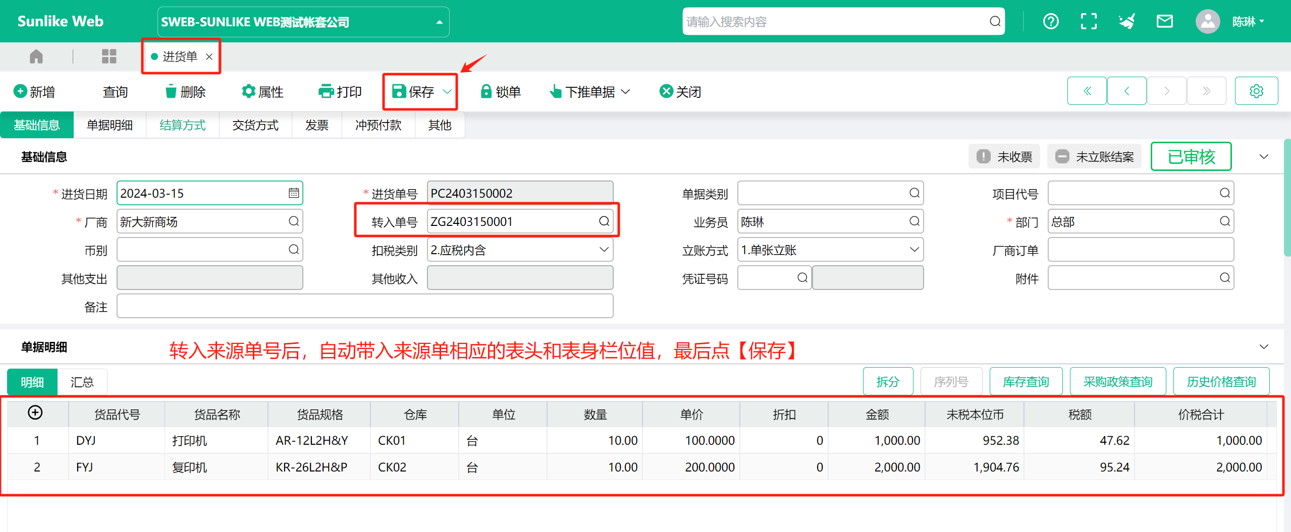6、转入来源单号后,自动带入来源单相应的表头和表身栏位值,最后点【保存】,如下图: