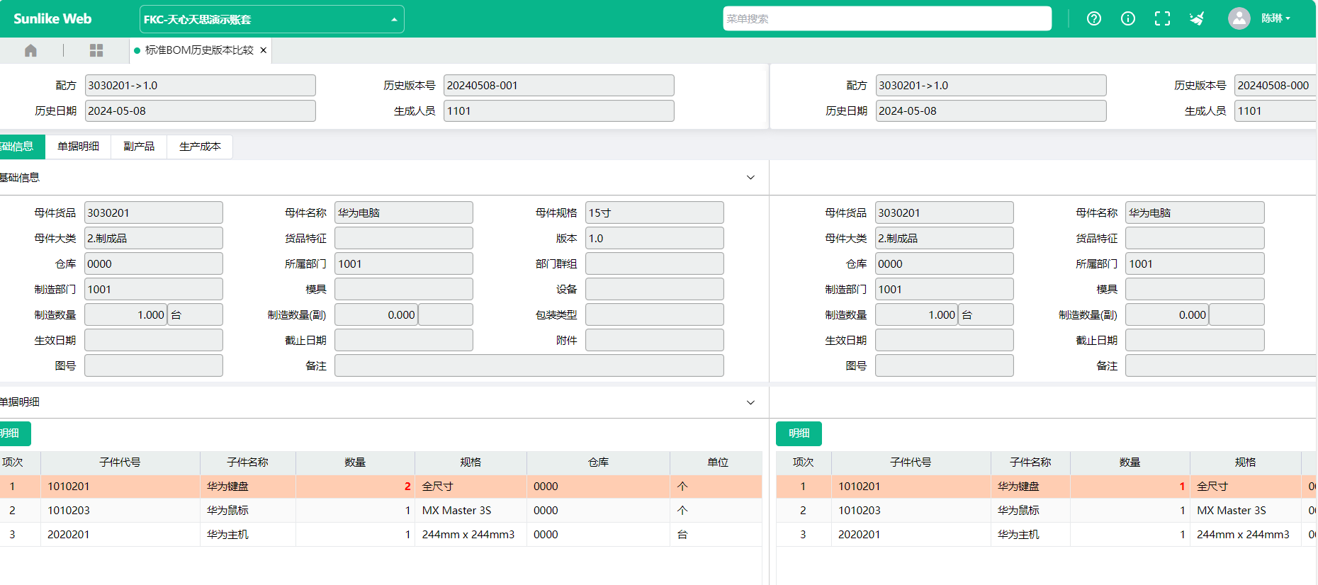 (4)如果需要比较两个标准BOM历史有何差异,可以选择两个不用的历史配方,点击比较按钮,进入【标准BOM历史版本比较】页签。有差异的行会显示为橘色,差异的栏位值显示为红色。
