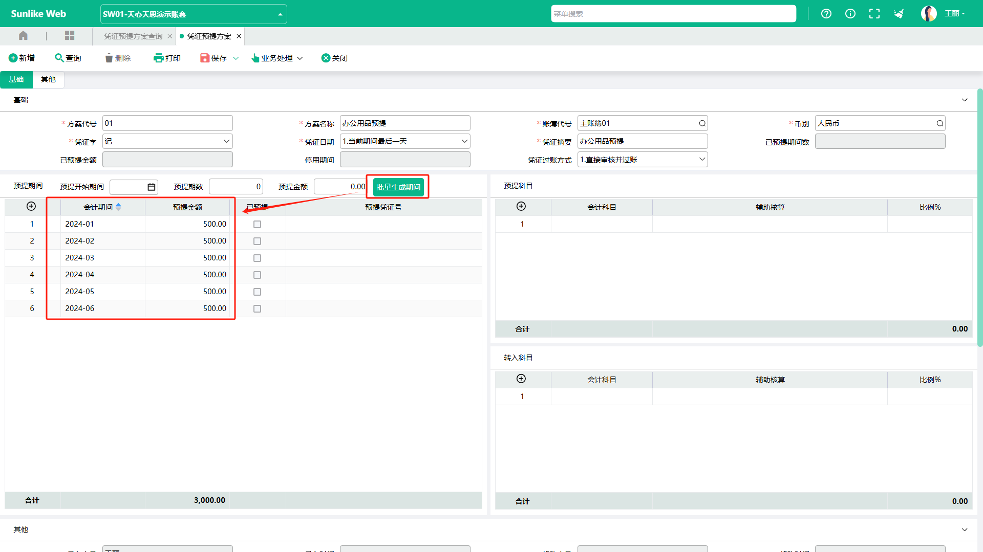 (7)点击【批量生成期间】,表身自动产生6行数据,【会计期间】从2024-01至2024-06,【预提金额】均为500。确认【预提金额】合计为3000。