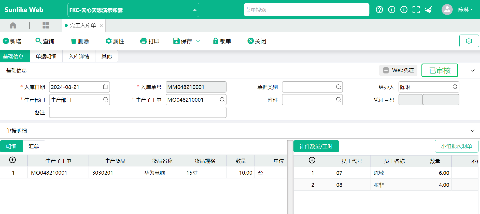 (1)菜单位置:生产管理–完工入库–完工入库单(SUNLIKE ERP 菜单:成品缴库单)。