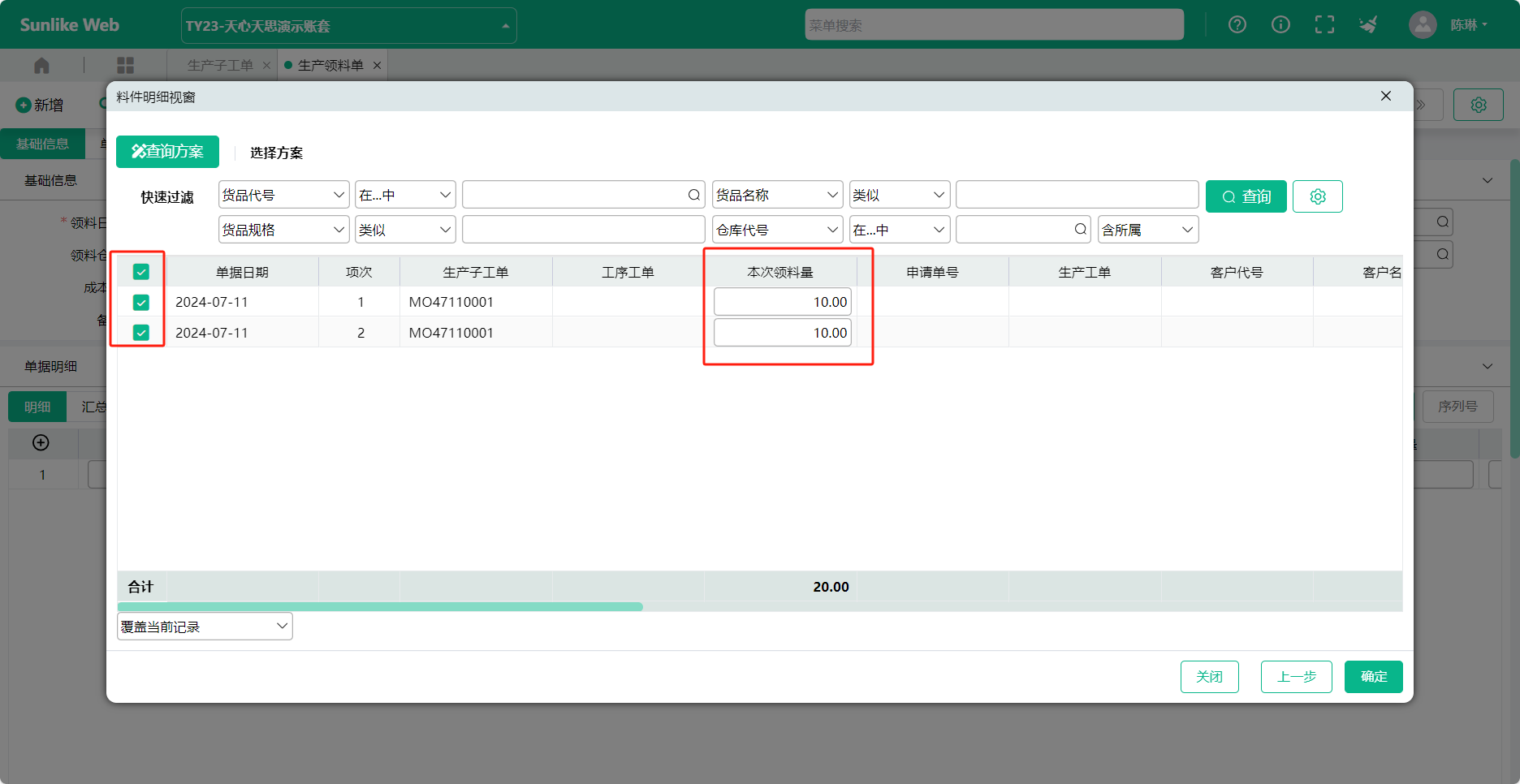 第二张生产子工单,需要螺丝10颗,那么领料的时候,直接领用余料仓的库存即可。有属性配合使用。属性:【考虑货品余料仓库存】勾选即可。