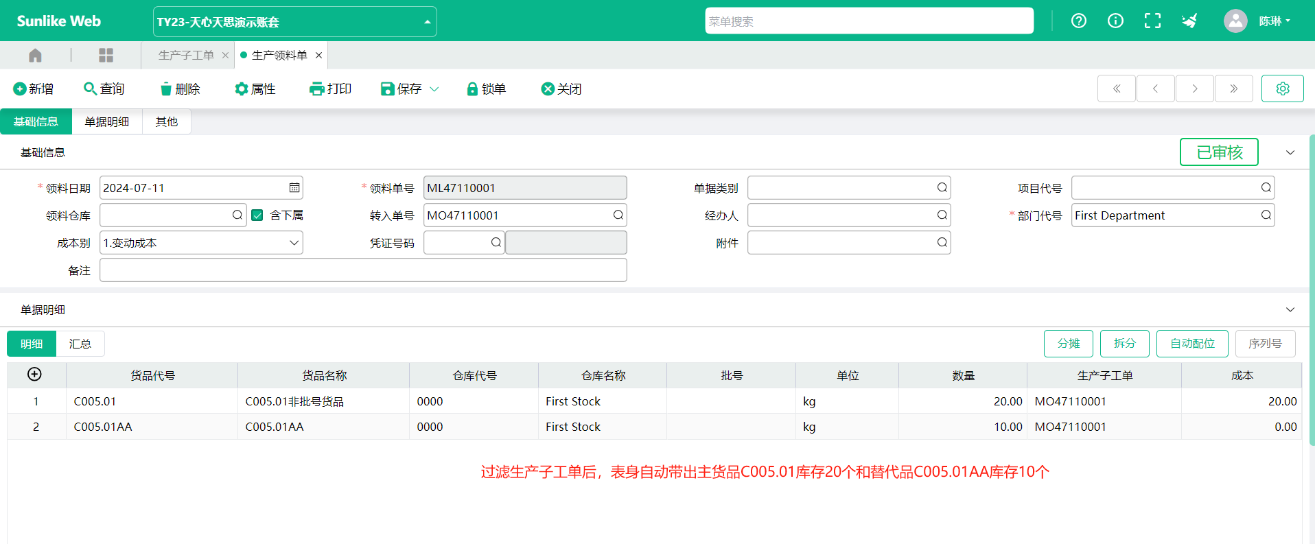 (3)生产领料单,在表头选择生产子工单或者工序工单或者生产领料申请单,当主产品的库存不足,替代品有库存,则转入到表身时,会自动带出替代品相应数据来。