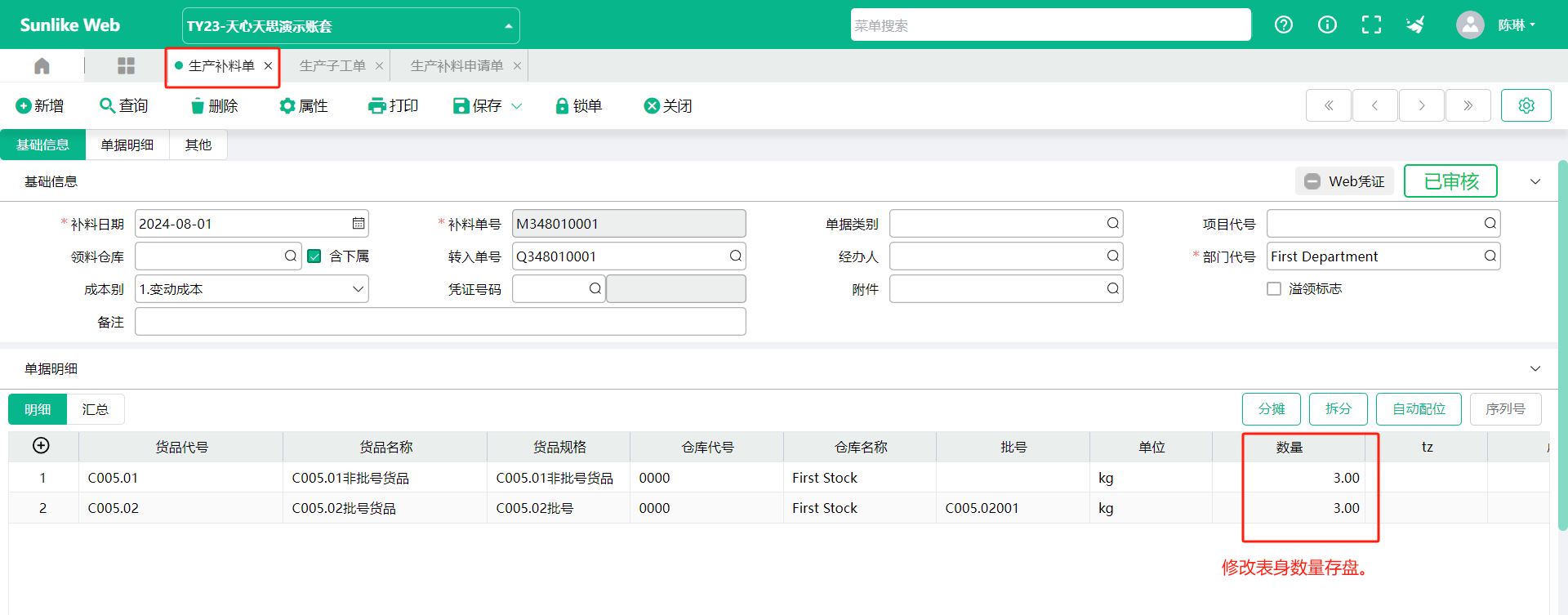 (3)新增生产补料单,表头转入单号选择申请单,转入生产领料申请后,可修改表身数量,最后点【保存】,如下图: