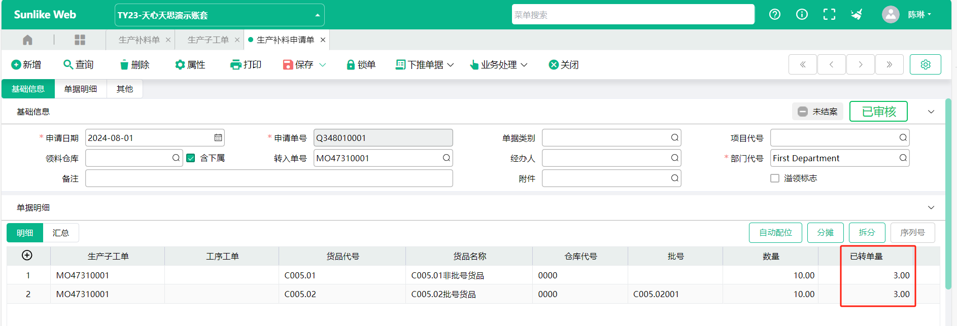 3、走申请流程——转入单号【 生产补料申请单 】操作示例: