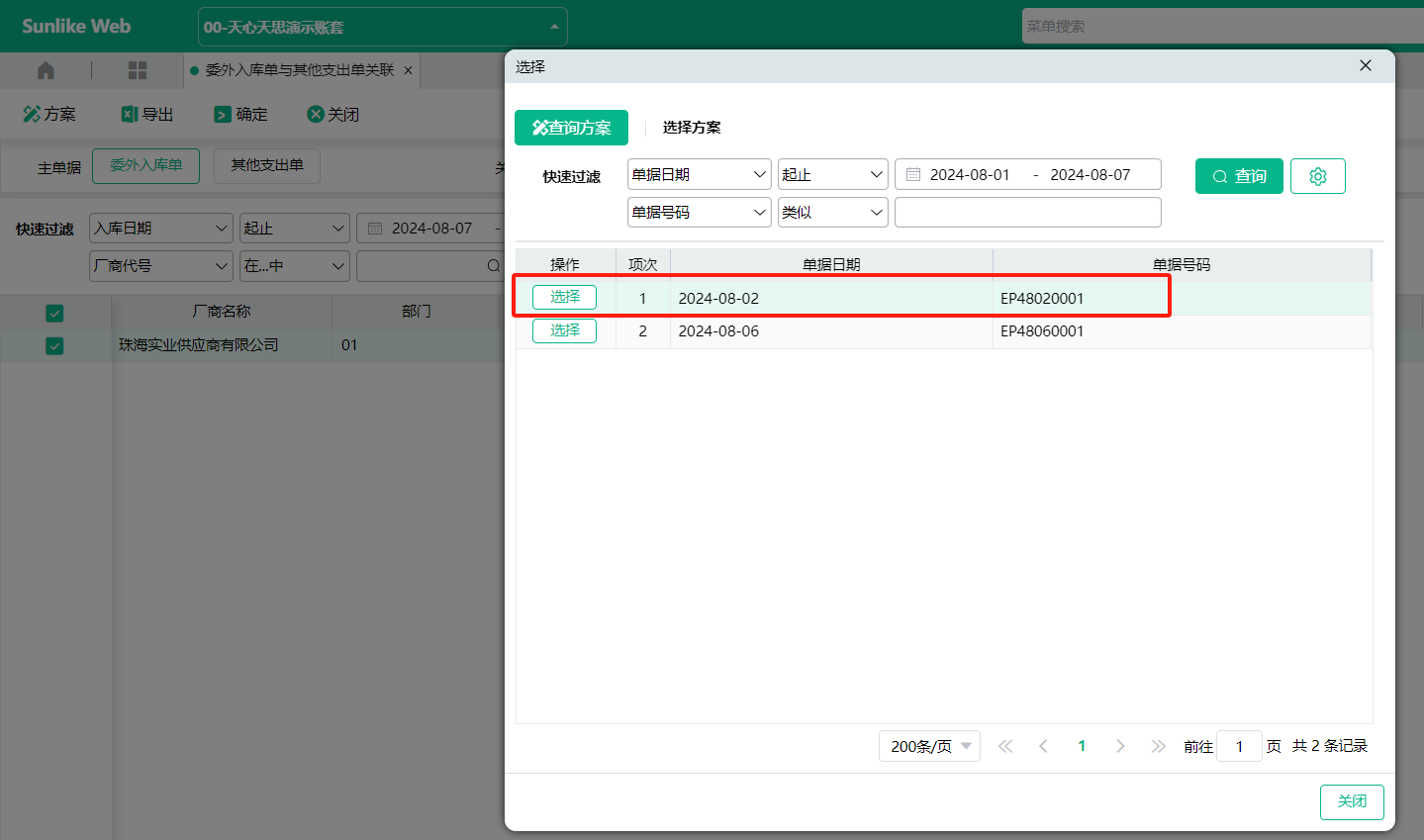 (2)、针对委外入库单记录,找到对应的“关联支出单号”栏位,点击放大镜,弹出窗口,通过过滤条件过滤出其他支出单记录,点击“选择”按钮