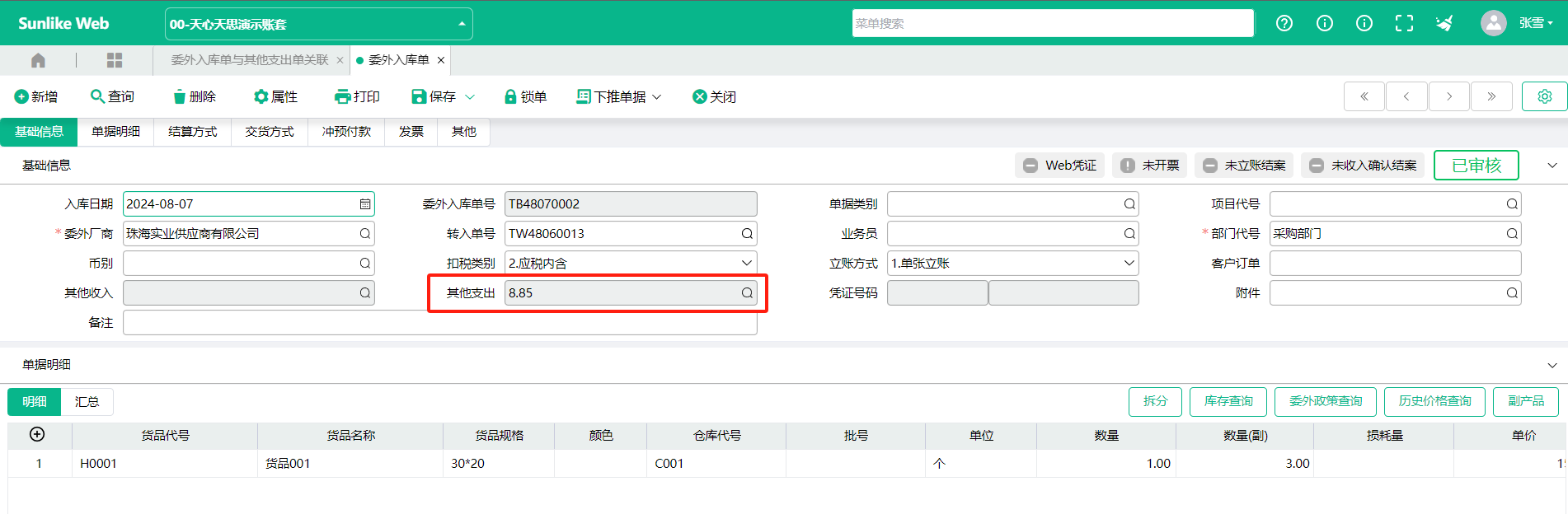 (3)、 关联的其他支出单号带入到表身,之后点击“确定”按钮,这样委外入库单与其他支出单就建立了关联,其他支出单对应的金额会回写委外入库单表头的其他支出栏位,委外入库单单号也会回写其他支出单表头的来源单号栏位