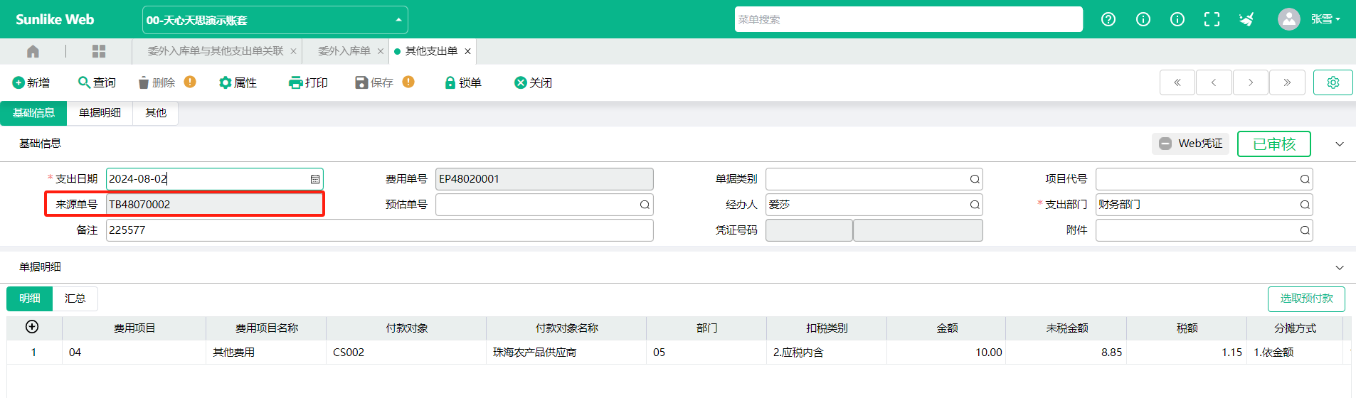 (3)、 关联的委外入库单号带入到表身,之后点击“确定”按钮,这样其他支出单与委外入库单就建立了关联,其他支出单对应的金额会回写委外入库单表头的其他支出栏位,委外入库单单号也会回写其他支出单表头的来源单号栏位