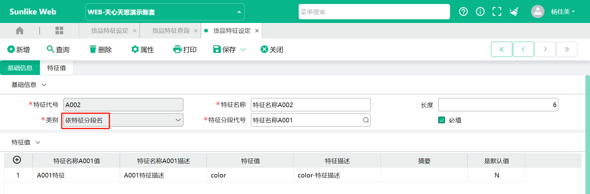 (3)继续新增特征代号,进入新增页面,系统会自动带出特征代号A002,设置特征类别:依特征分段名,在特征分段代号选择分段代号A001,输入表身:特征名称A001值、特征名称A001描述、特征值、特征描述,存盘。