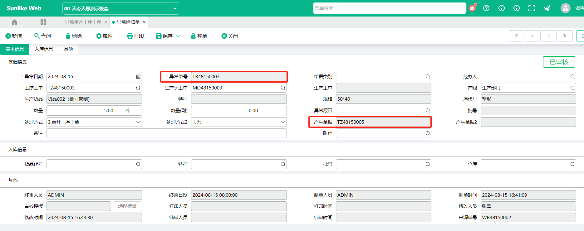 - 来源单回写:将生成的工序工单单号回写到异常通知单对应的“产生单据”或“产生单据2”栏位