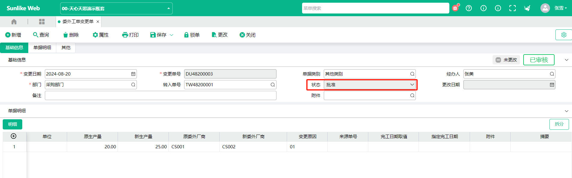 菜单位置:委外管理-委外管理-委外变更-委外变更单