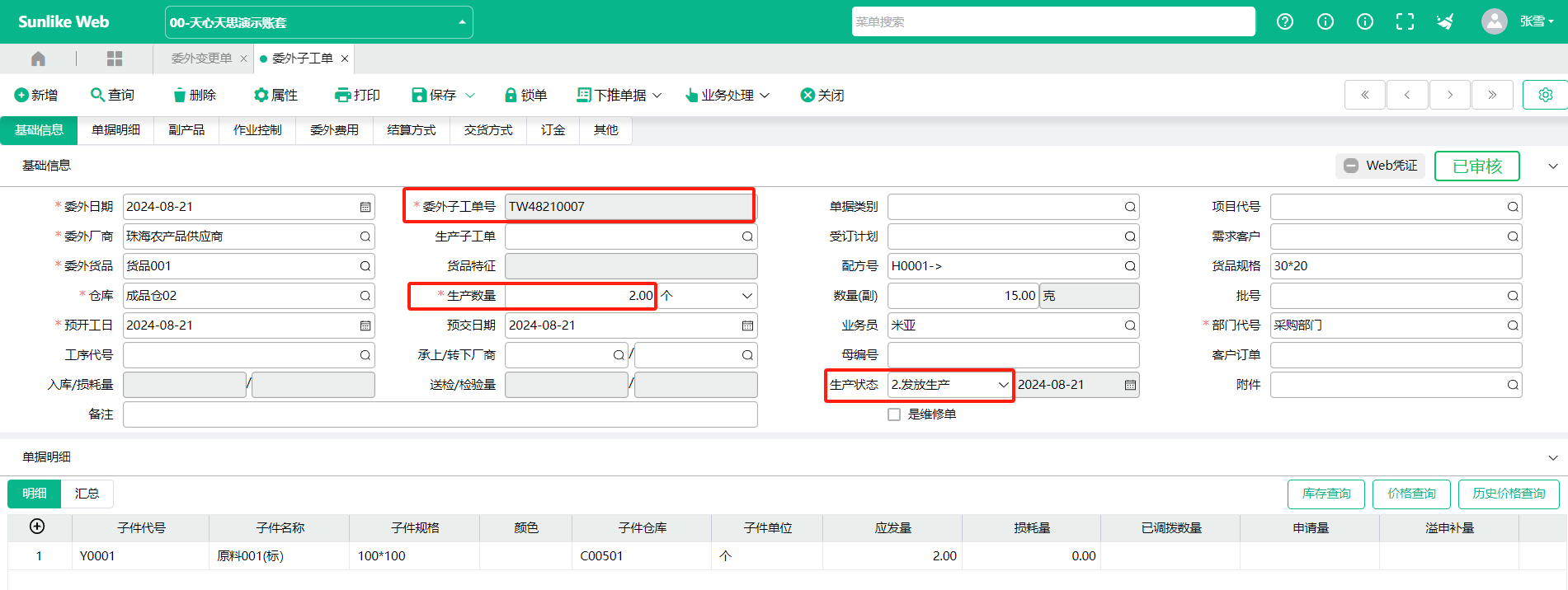 (9) 、查询委外子工单,发现委外数量和委外厂商已变成新值