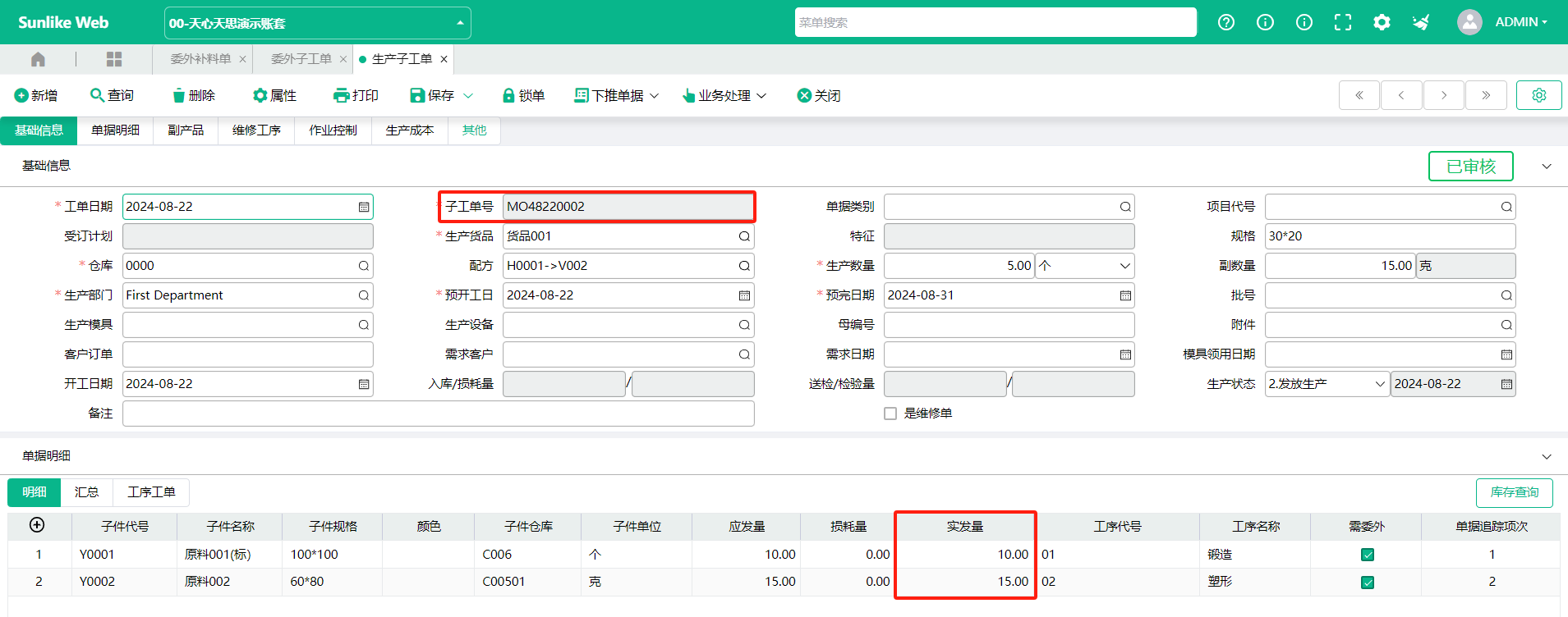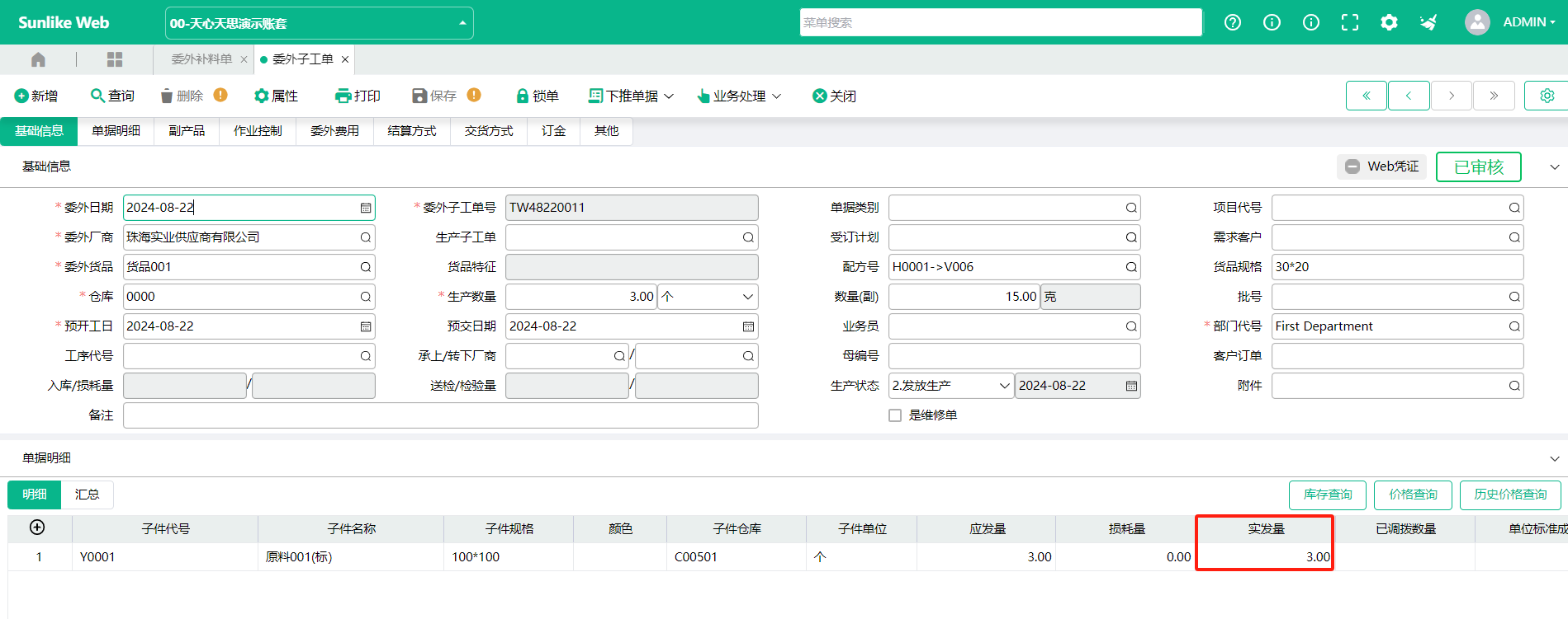 (4)、 回写委外子工单的实发量:主货品的实发数会包含替代品的实发数,同时也会将替代品作为新增货品回写至委外子工单中。