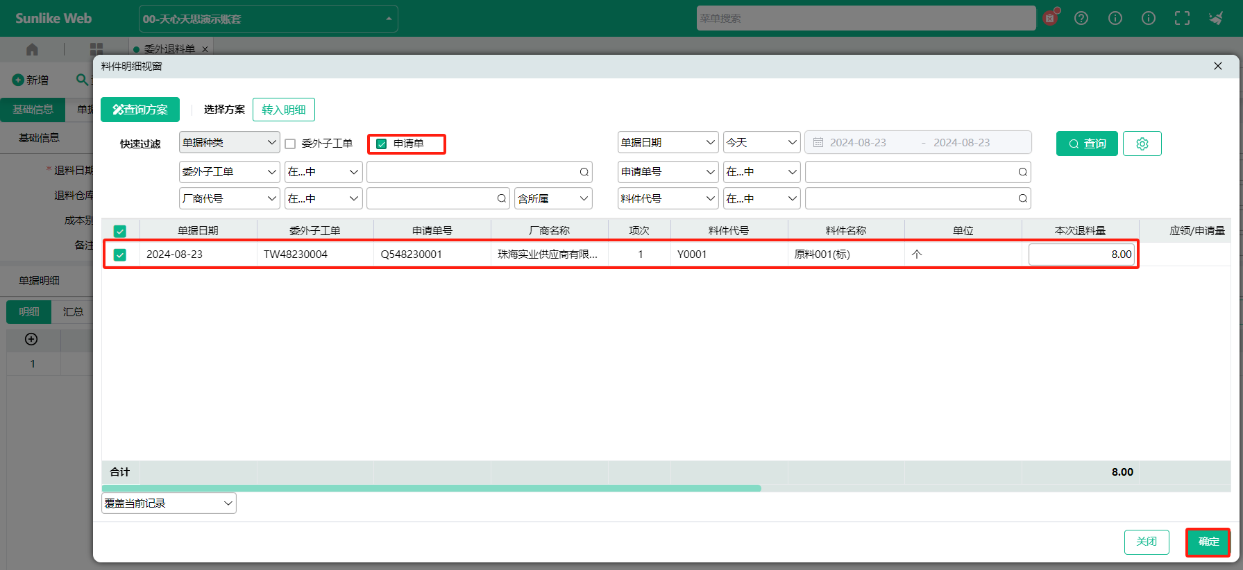 (4)、委外退料单,表头转入单号选择申请单,修改本次补料量,点击【确定】。