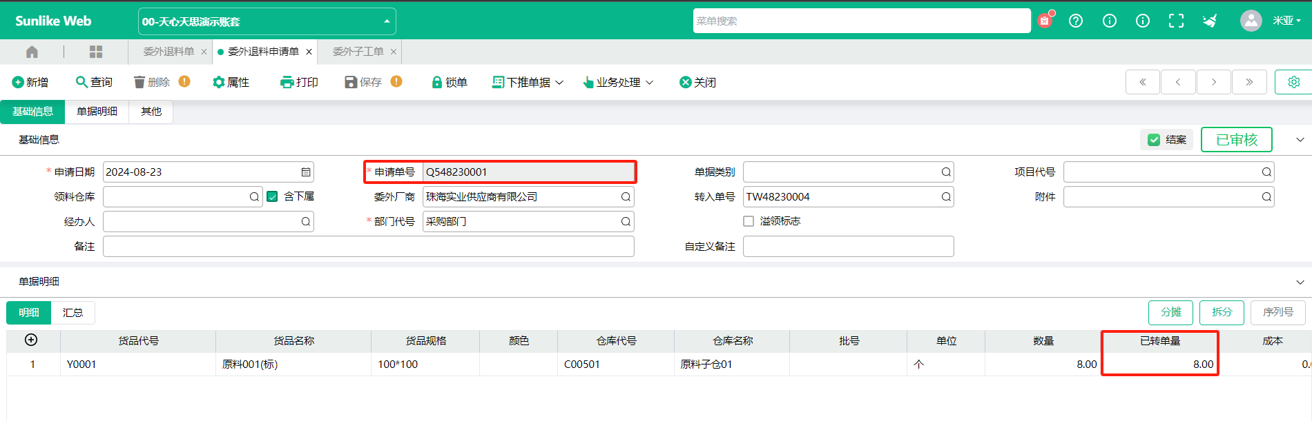 3、走申请流程——转入单号【委外退料申请单】操作示例