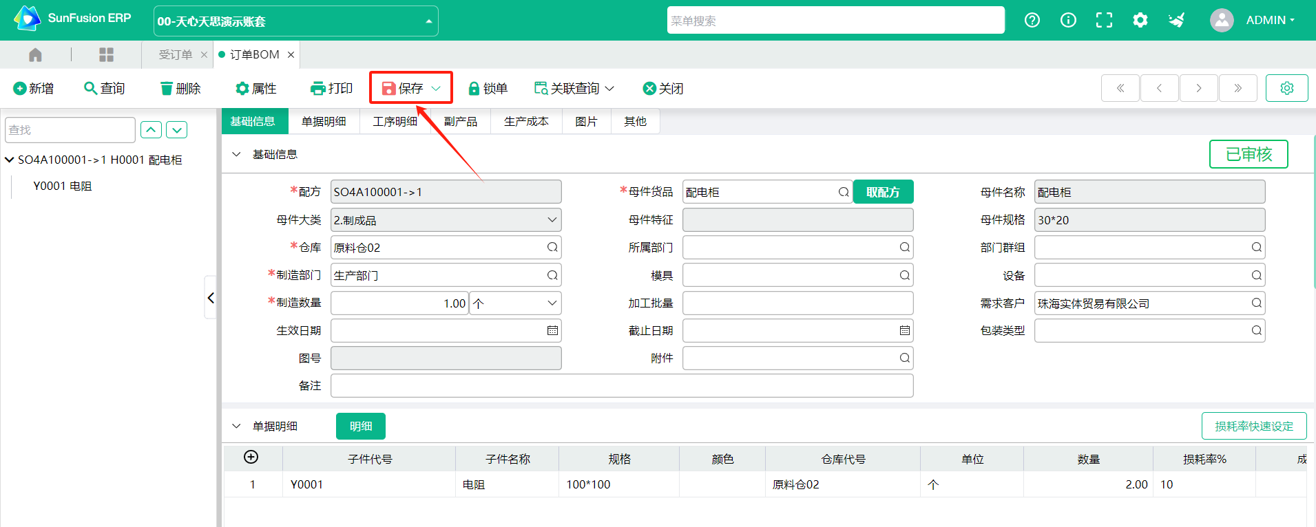 (2)当受订单配方为空时,在订单BOM配方查询视窗过滤出该笔受订单数据做订单BOM,输入对应的子件信息,之后保存,订单BOM会回写受订单表身配方号。
