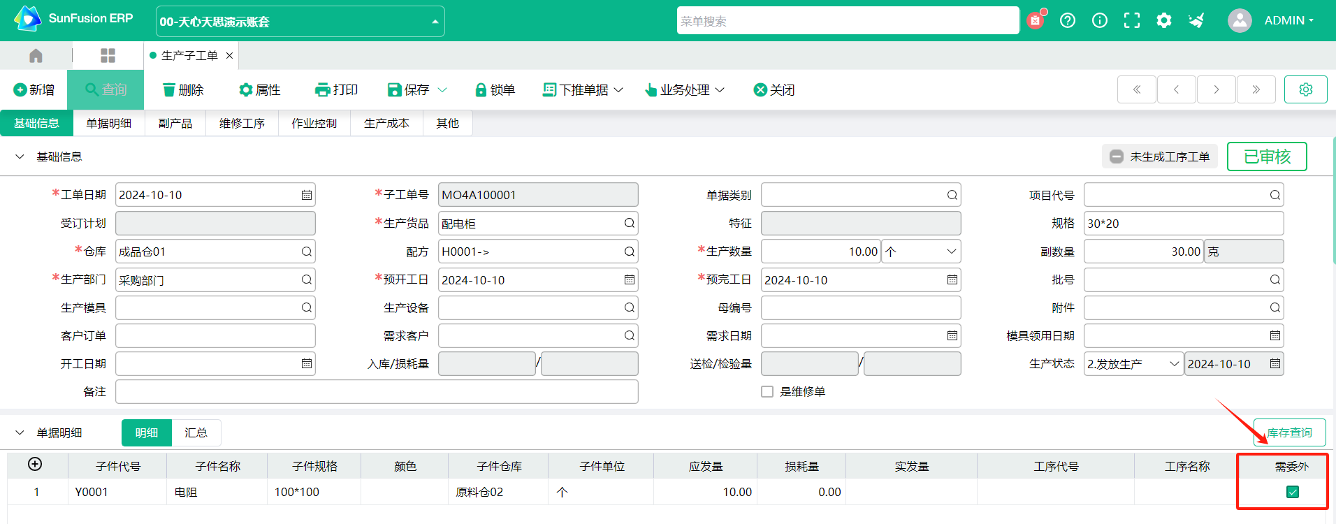 (1)当自主生产的货品需要委外加工的时候,可在生产子工单表身对应料件处勾选“需委外”。
