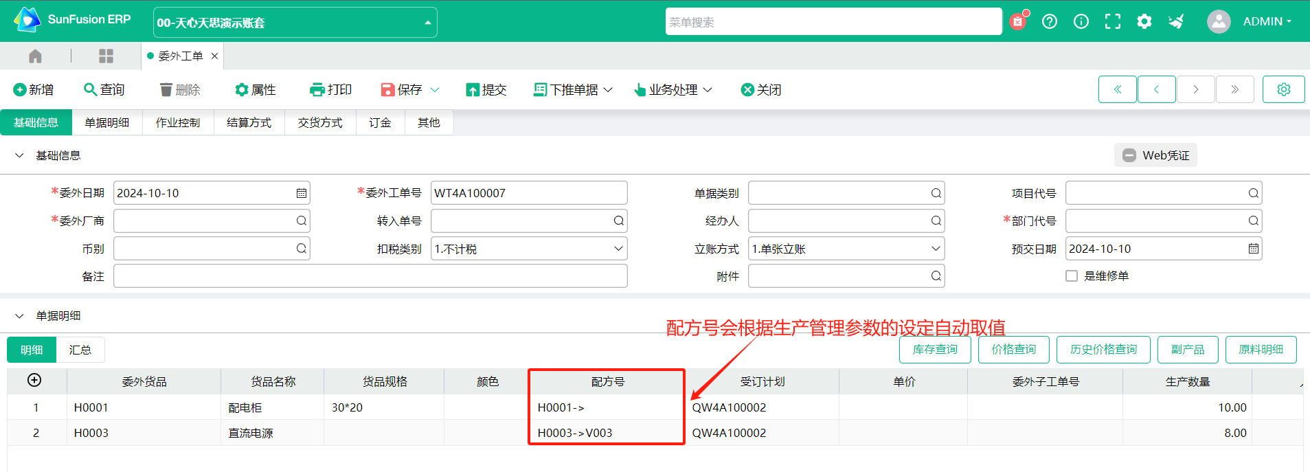 (3)委外工单保存后,会自动生成委外子工单,单号会回写到委外工单表身“委外子工单号”栏位