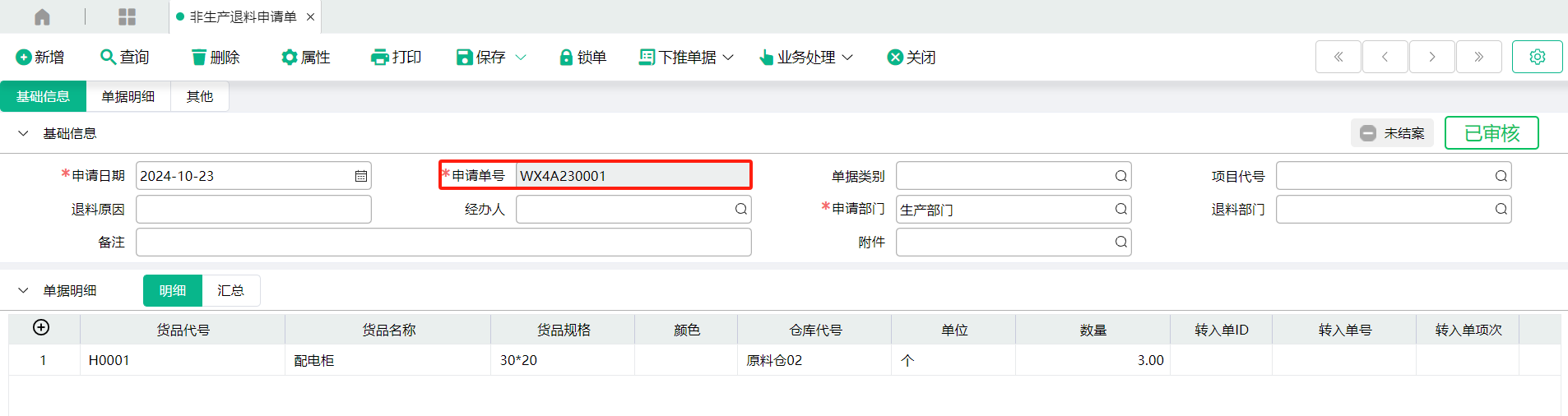 非生产退料单终审后,会增加非生产退料申请单表身的“退料量”。
