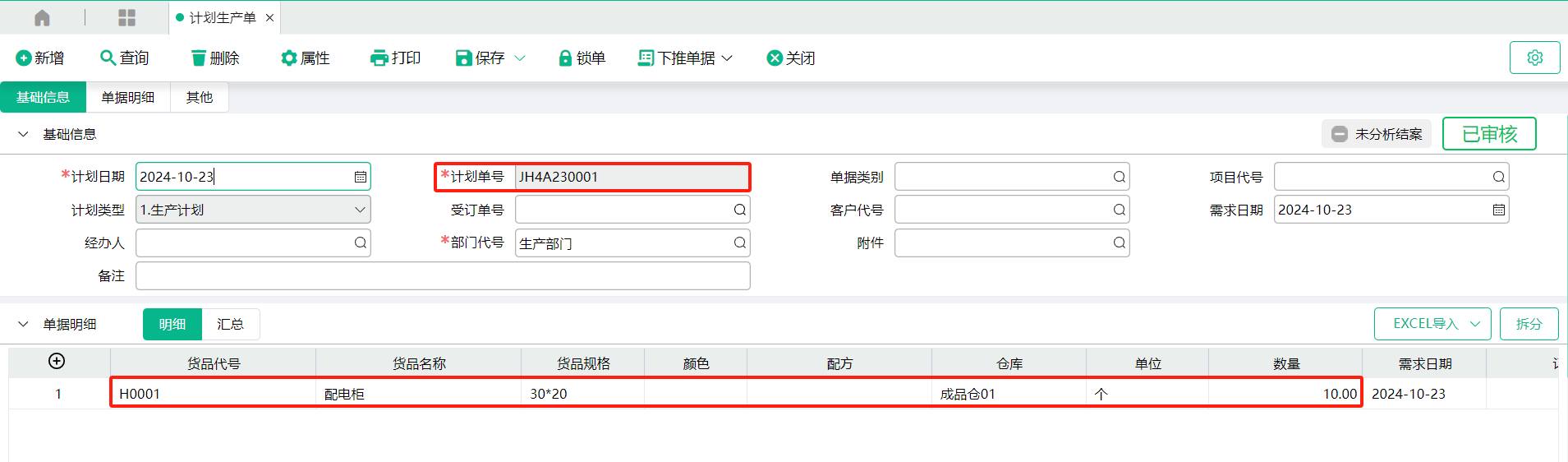 2、转入单号【计划生产单】操作示例