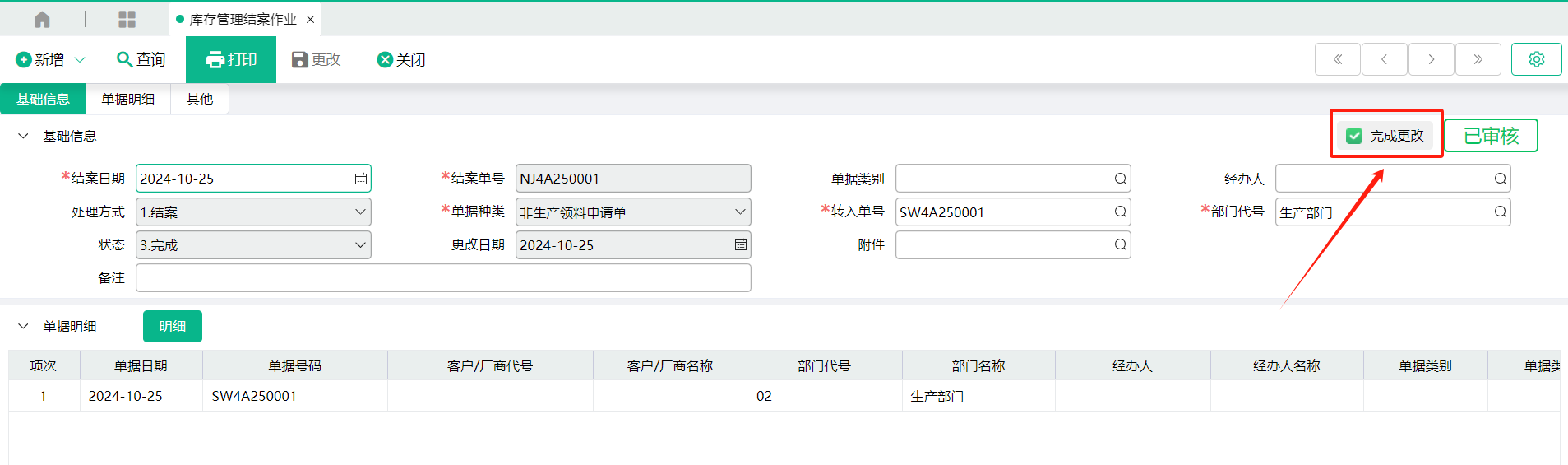 非生产领料申请单通过库存管理结案作业已经做了结案处理