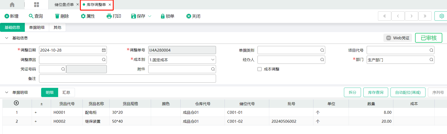(10)、如果差异数量小于0,点击【盘亏处理】按钮来生成库存调整单,生成库存调减单,减少库存