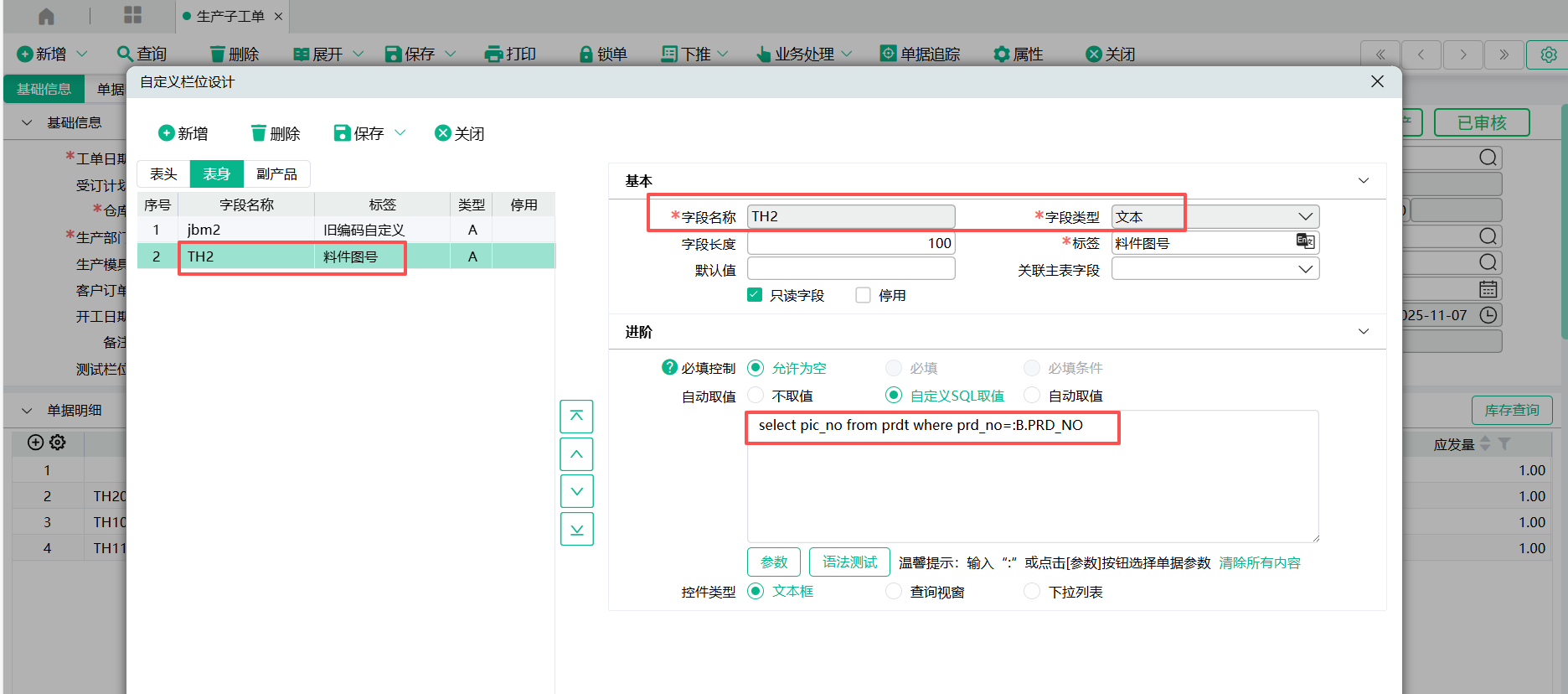 (1)例如:生产子工单表身设置了自定义字段TH2(大写),取货品档里的图号栏位值。