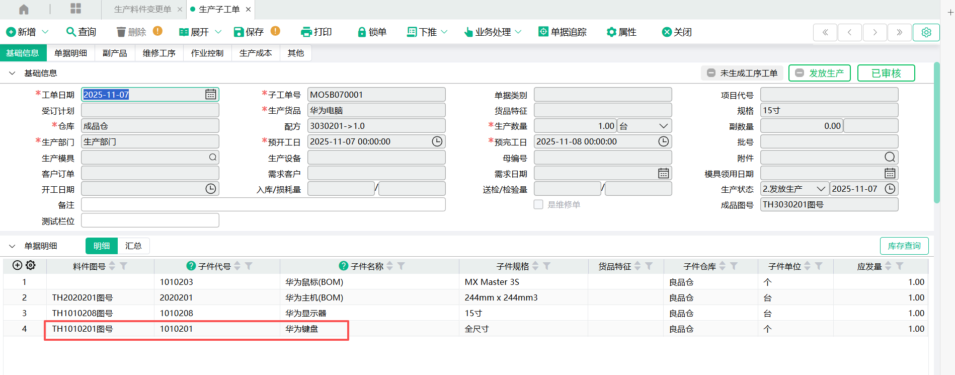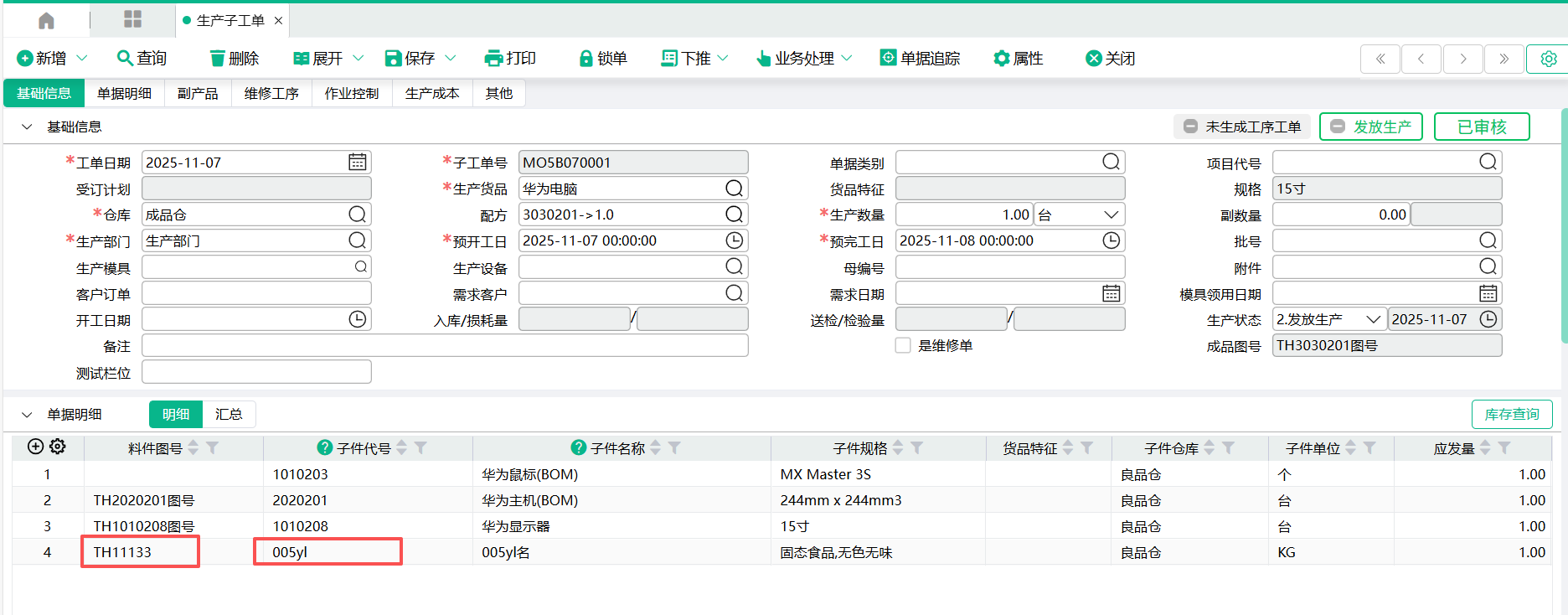 (4)新料件代号,新应发量,新仓库输入值,保存,点击更改按钮,执行更改成功完成之后,生产子工单表身会追加该笔子件数据。