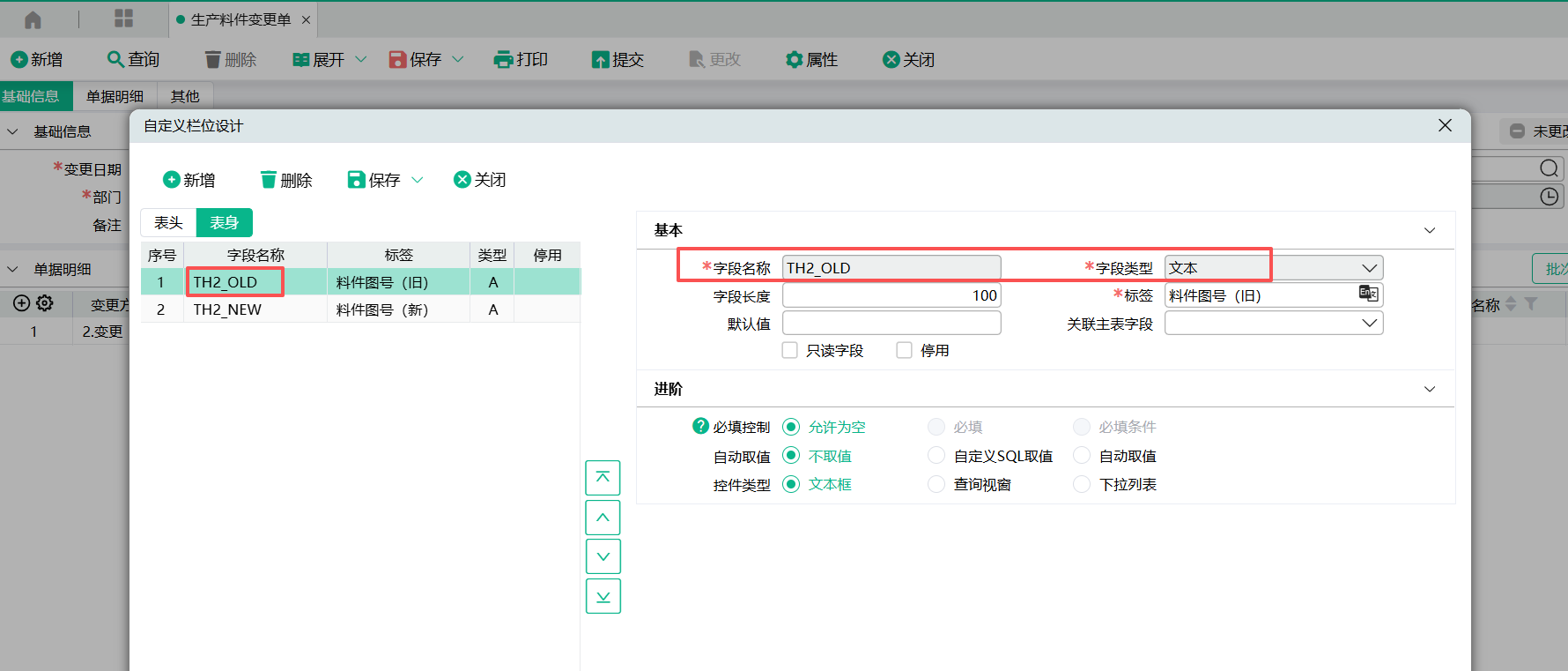 注意:变更生产单表身的定义字段,需要在生产料件变更单新增两个自定义栏位,自定义格式为XXXX_OLD和XXXX_NEW,类型和长度需与生产单表身自定义栏位保持一致。