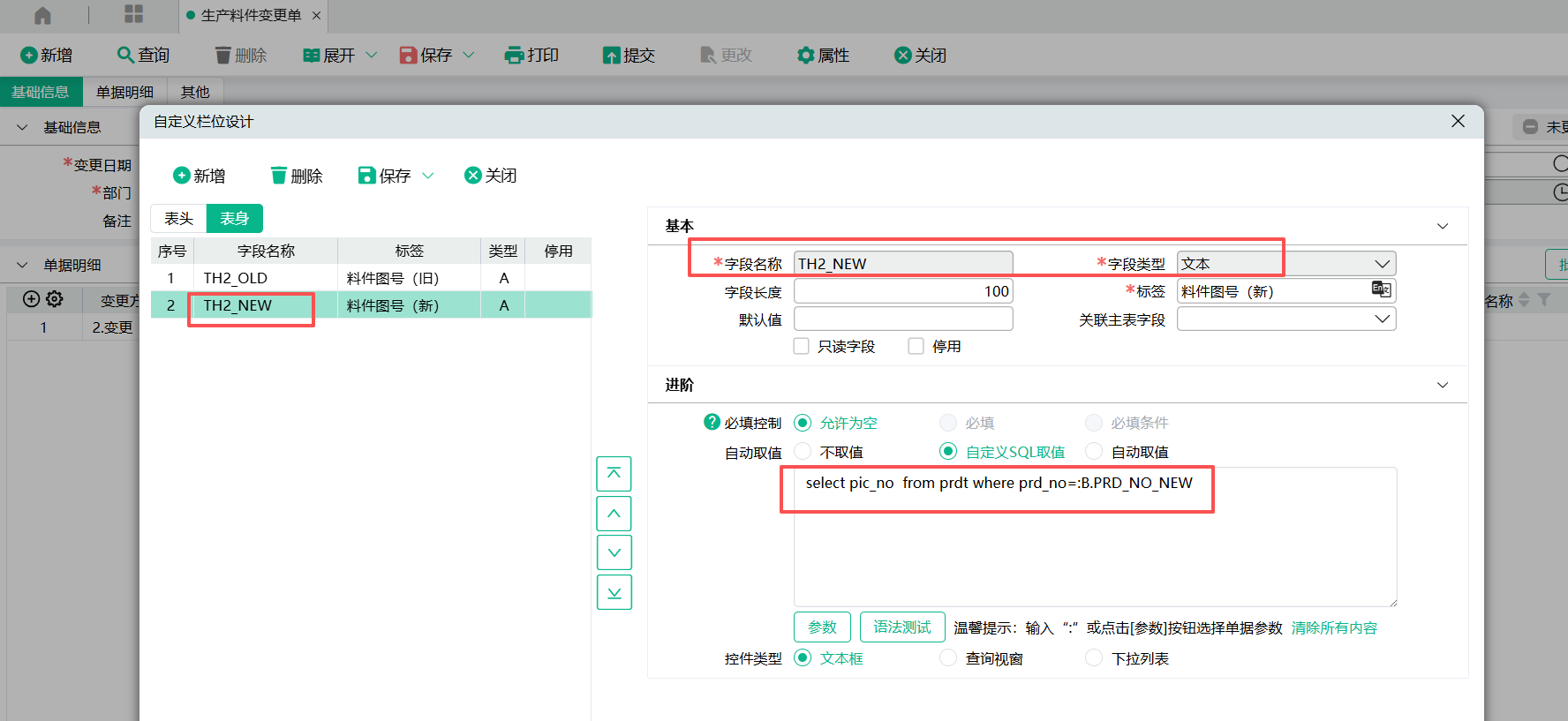 (4)修改新料件代号,保存 TH2_ NEW 会自动根据SQL语句取值。