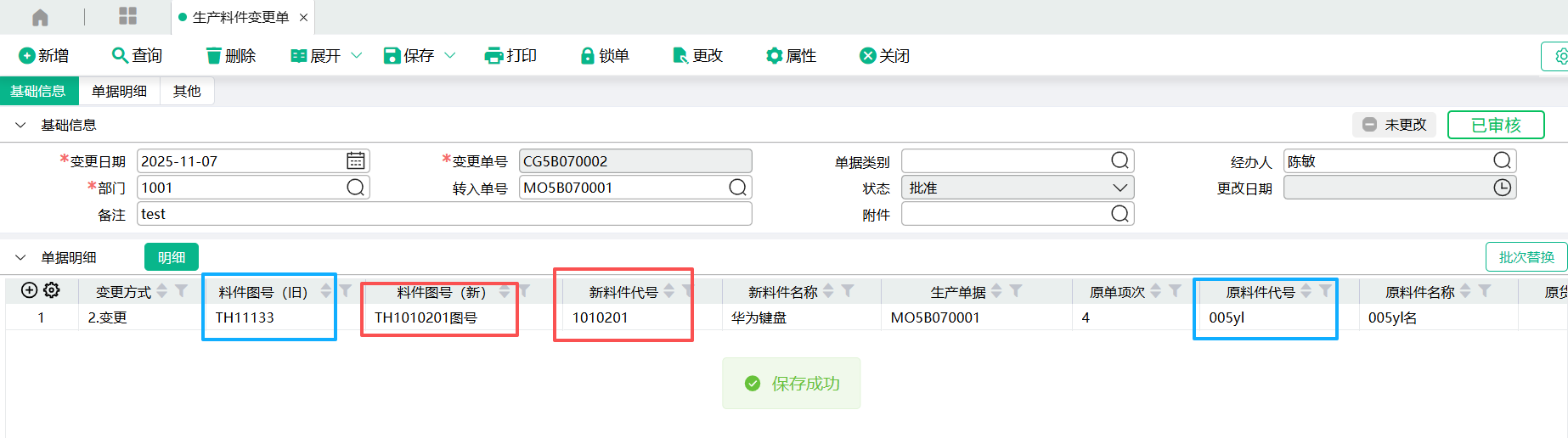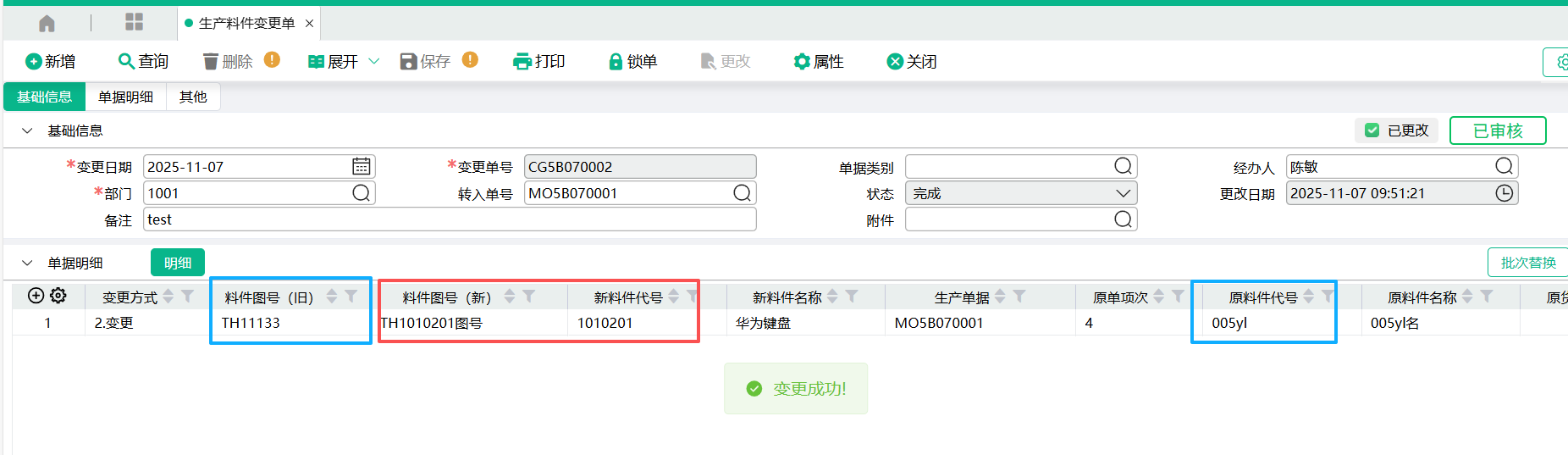 (4)新料件代号,新应发量,新仓库输入值,保存,点击更改按钮,执行更改成功完成之后,工序工单和生产子工单表身都会追加该笔子件数据。