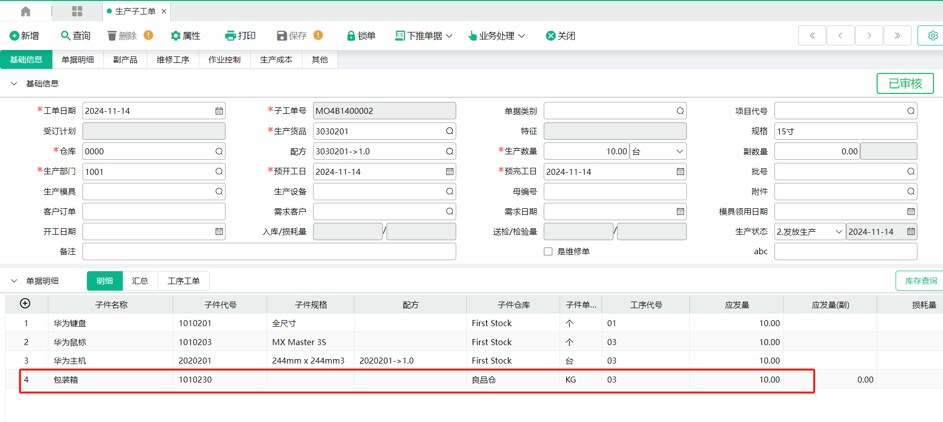(3)点击保存,执行更改,更改成功之后,生产子工单表身该笔子件数据会删除。