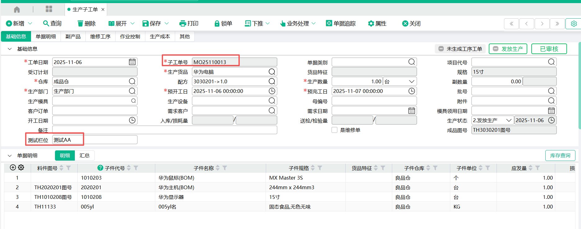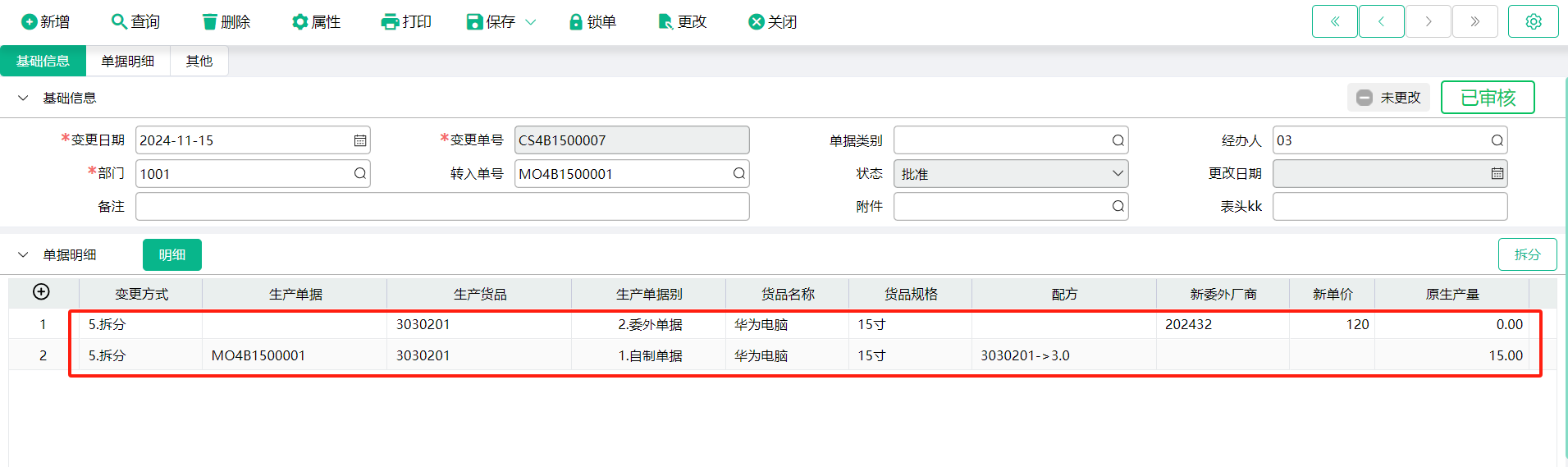 (5)点击更改,更改成功之后,新拆分出来的那笔数据,生产单据才有值,就把原来的生产子工单拆分成两张单据。