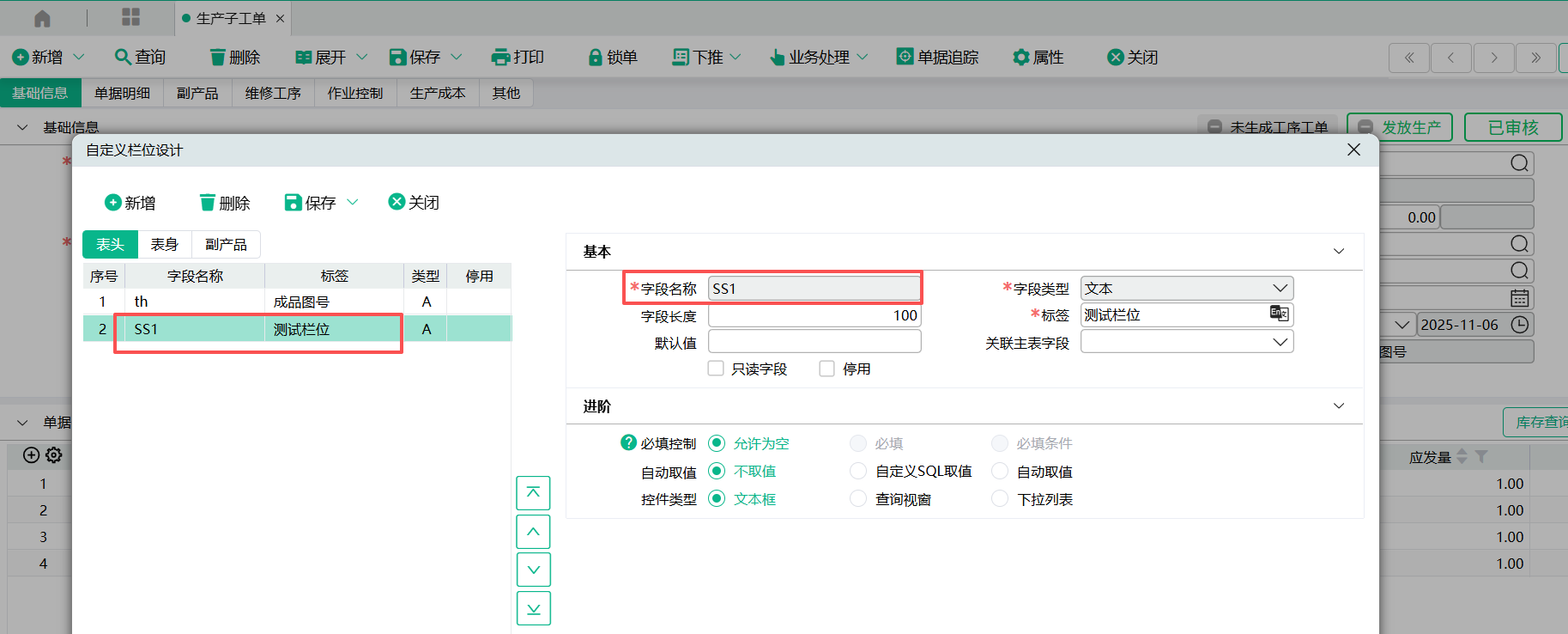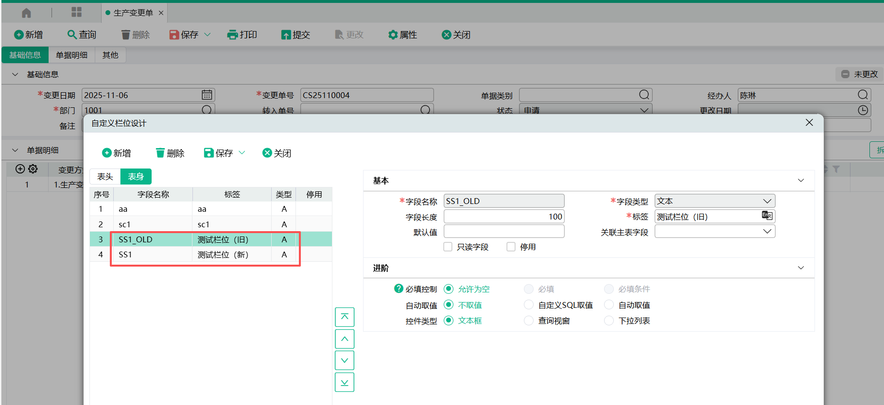 (2)生产变更单里要变更生产子工单表头自定义SS1,可以在生产变更单新增表身自定义字段SS1_OLD和SS1。类型和长度都与生产子工单表头自定义SS1一样。